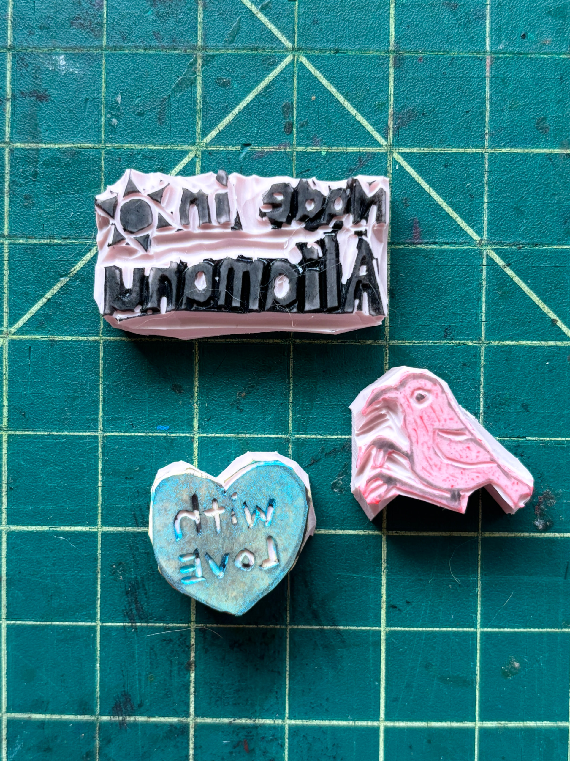 Earlier this year, I finally decided to make some new stamps for the backs of my ATCs, and here they are!
