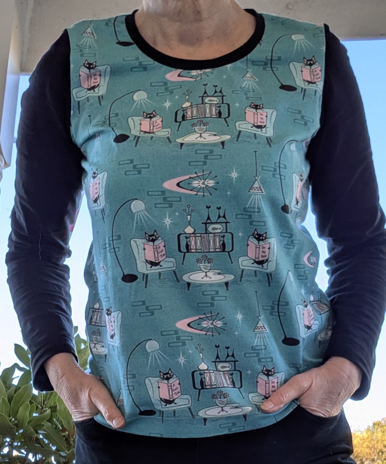 Fabric: Cozy Cats Den from Spoonflower printed on cotton spandex (custom scaled to an 8” wide repeat). Sleeves and neckband in a black knit of unknown origin that I found in my fabric pile.