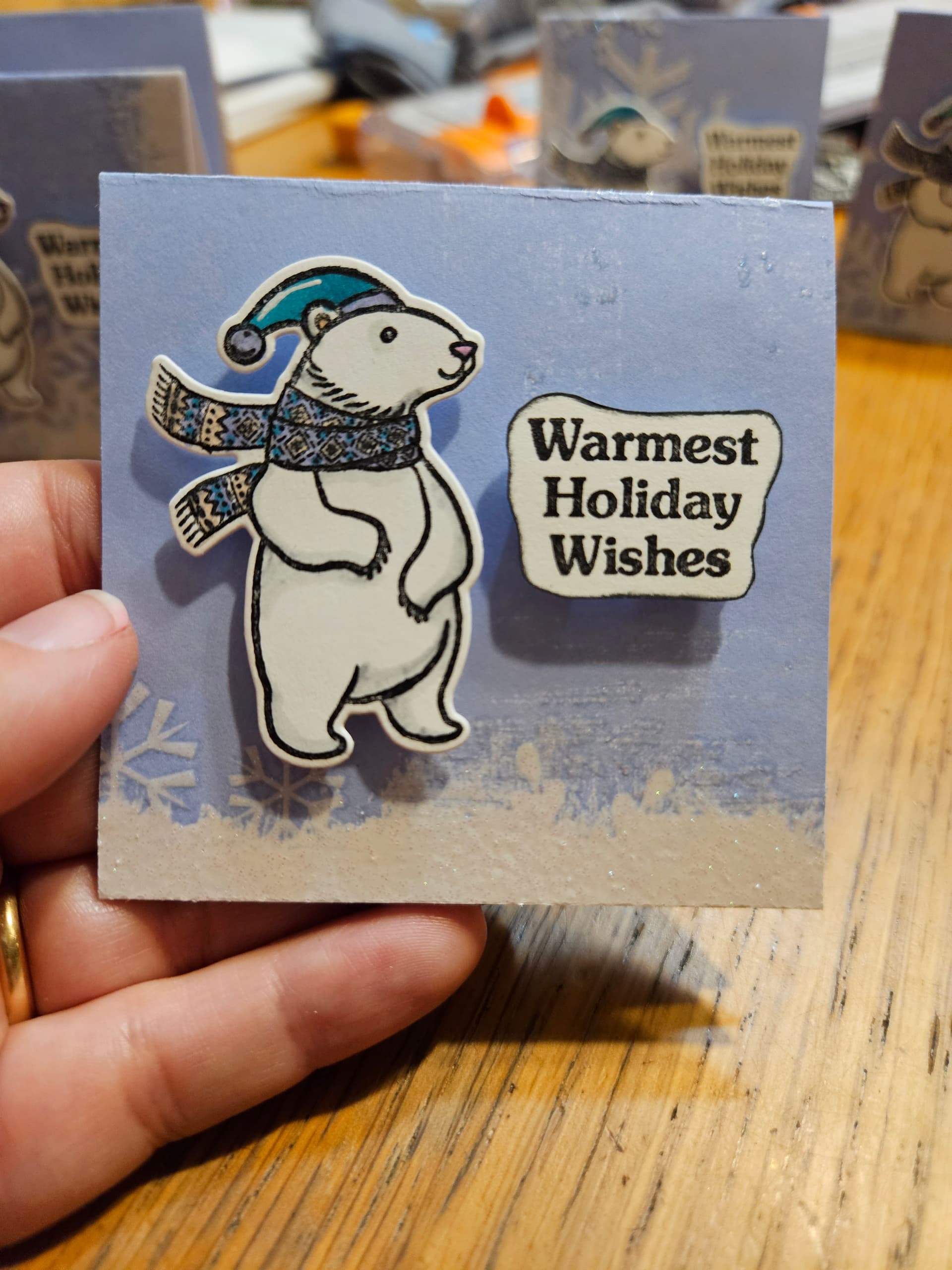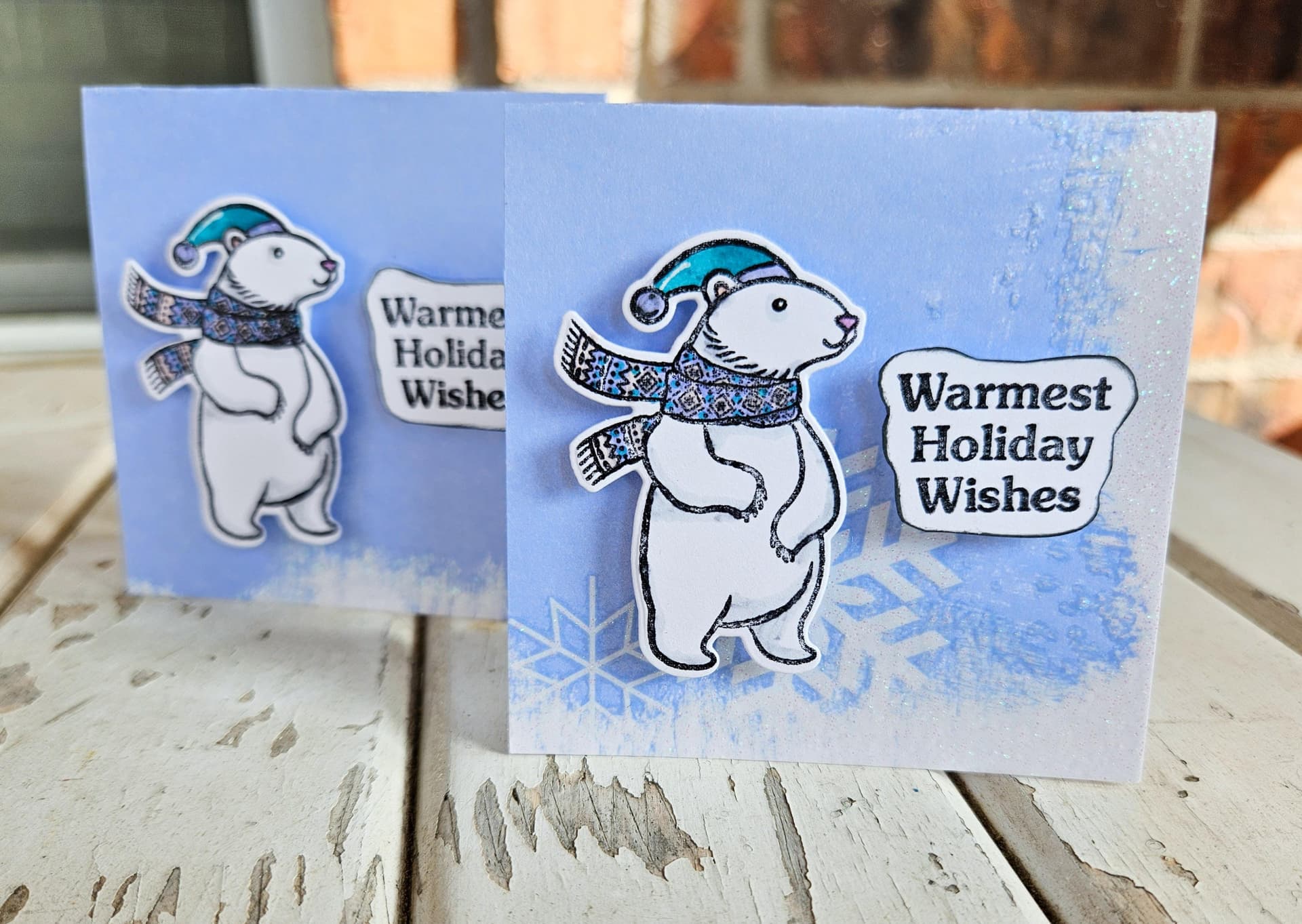 I used some pretty snowflake scrapbook paper as the card base. Because the paper has decor around the edges, each card is different. The bears are stamped and then colored with alcohol marker. Each card is 3x3".