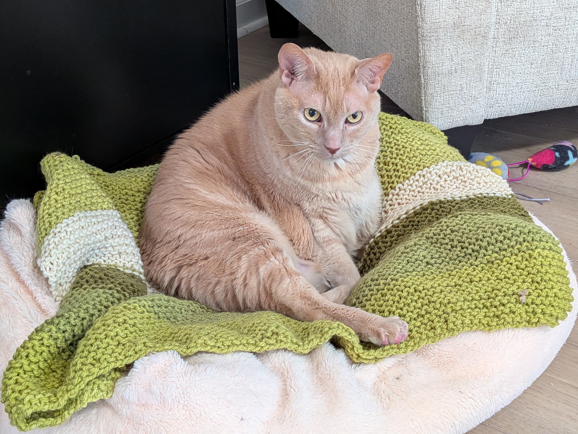 I knitted a new blanket for cat. He drags them around the house and they get torn up. I’ve already started knitting a new one for when this one bites the dust.