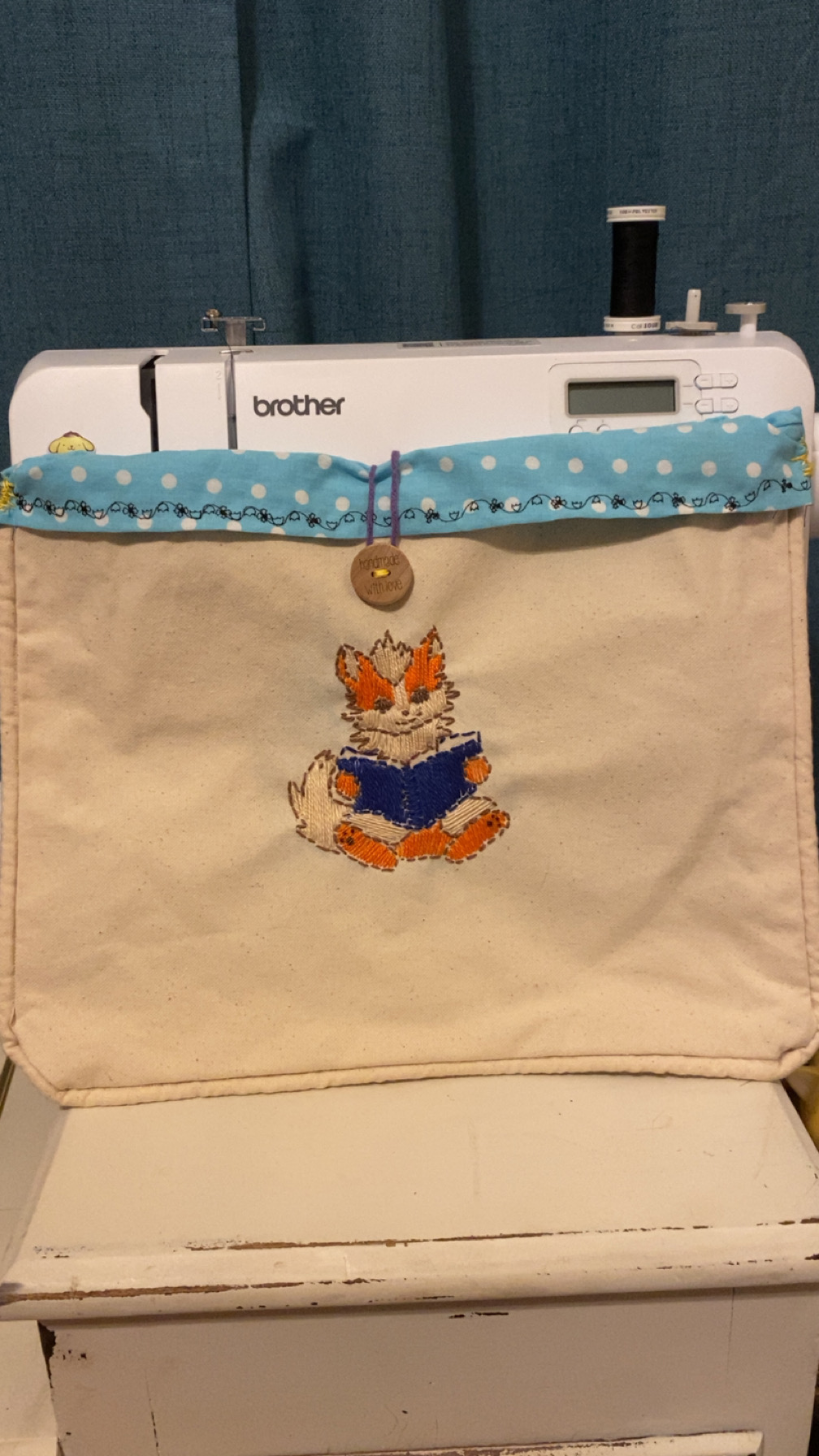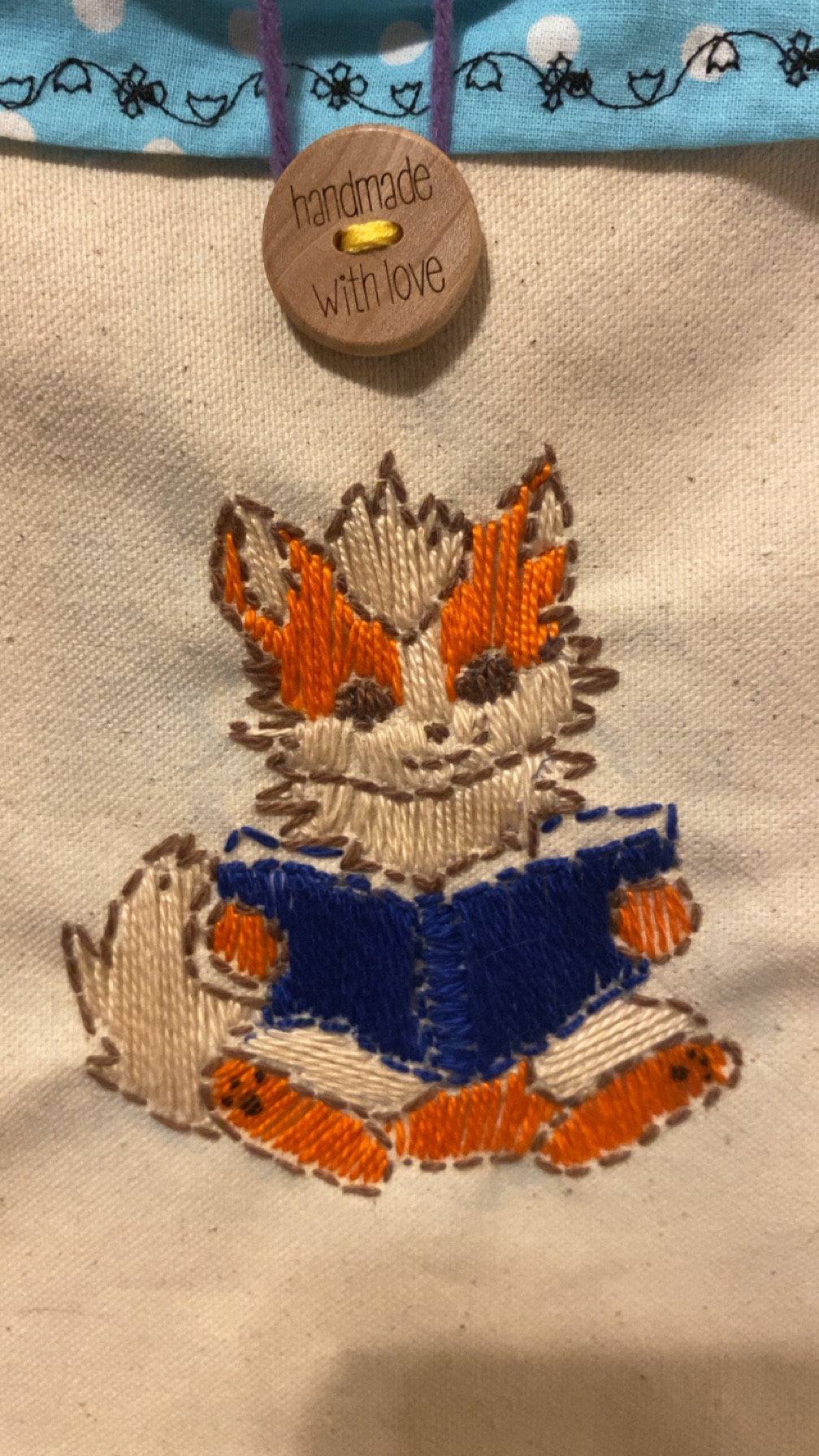 The embroidery is cute and so personalized with the book color matching their book. I also love that this is a joint project with your mom (kind of). The bag is great, and I love watching your creativity grow! Such a wonderful, heartfelt gift.