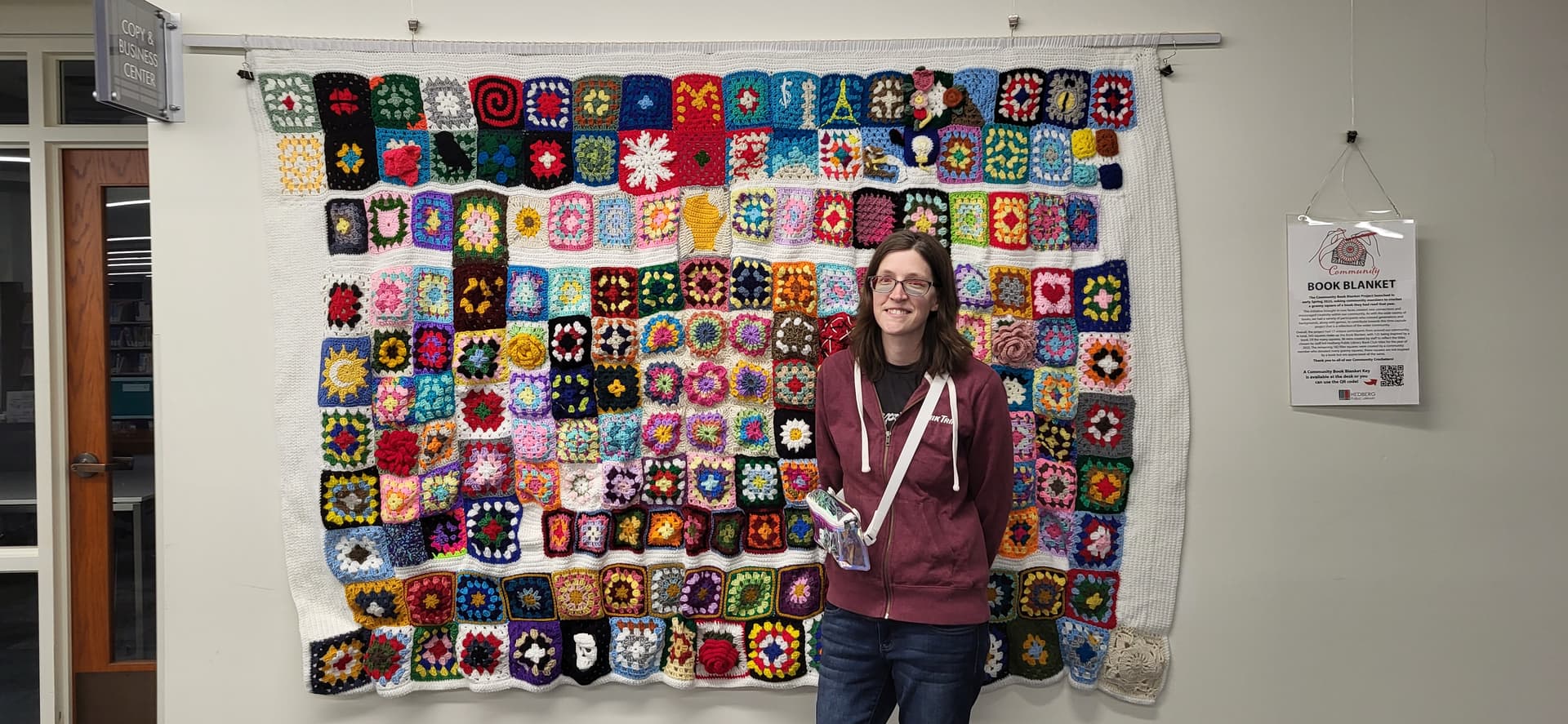 I went to the library today for the unveiling of the community book blanket! I was one of two crocheters who showed up, besides the library staff who had contributed. There will be a bigger write-up soon when the library puts out the blog post, but for now here is me with the blanket! You can see my squares in the second to bottom row, minus the first and last squares.