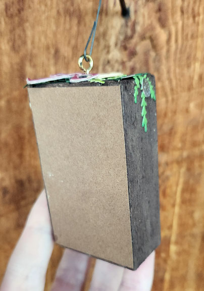 If this were a non-ornament mini, I would have covered the foam to look more like pages, but it is great for making lots of books. I could have cut a long strip the depth of the shelves, covered the whole thing with a strip of paper, then cut various heights of books off the strip. Since most of the color variation of this is from inking the paper, that would’ve worked a treat. I probably would’ve done it that way if I’d had shelves and shelves to fill. BUT then all the books would be the same thickness - so… I’m going to remember the craft stick trick!