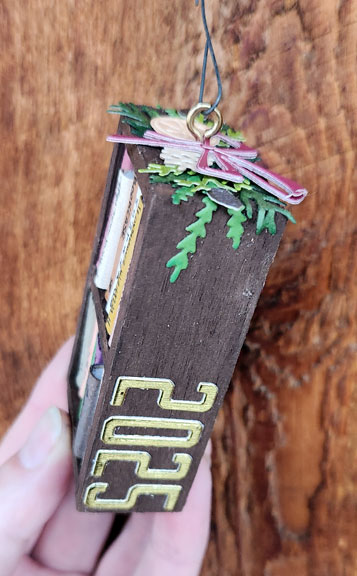 Since 2020 I have found an ornament that kind of represents our year and I make an embellished tag with the year. This year, I decided on a bookcase to represent my building that HUGE bookcase and TheMisterT finally just about filling that bookcase. I didn’t find a satisfying premade version, so I decided to make one myself.