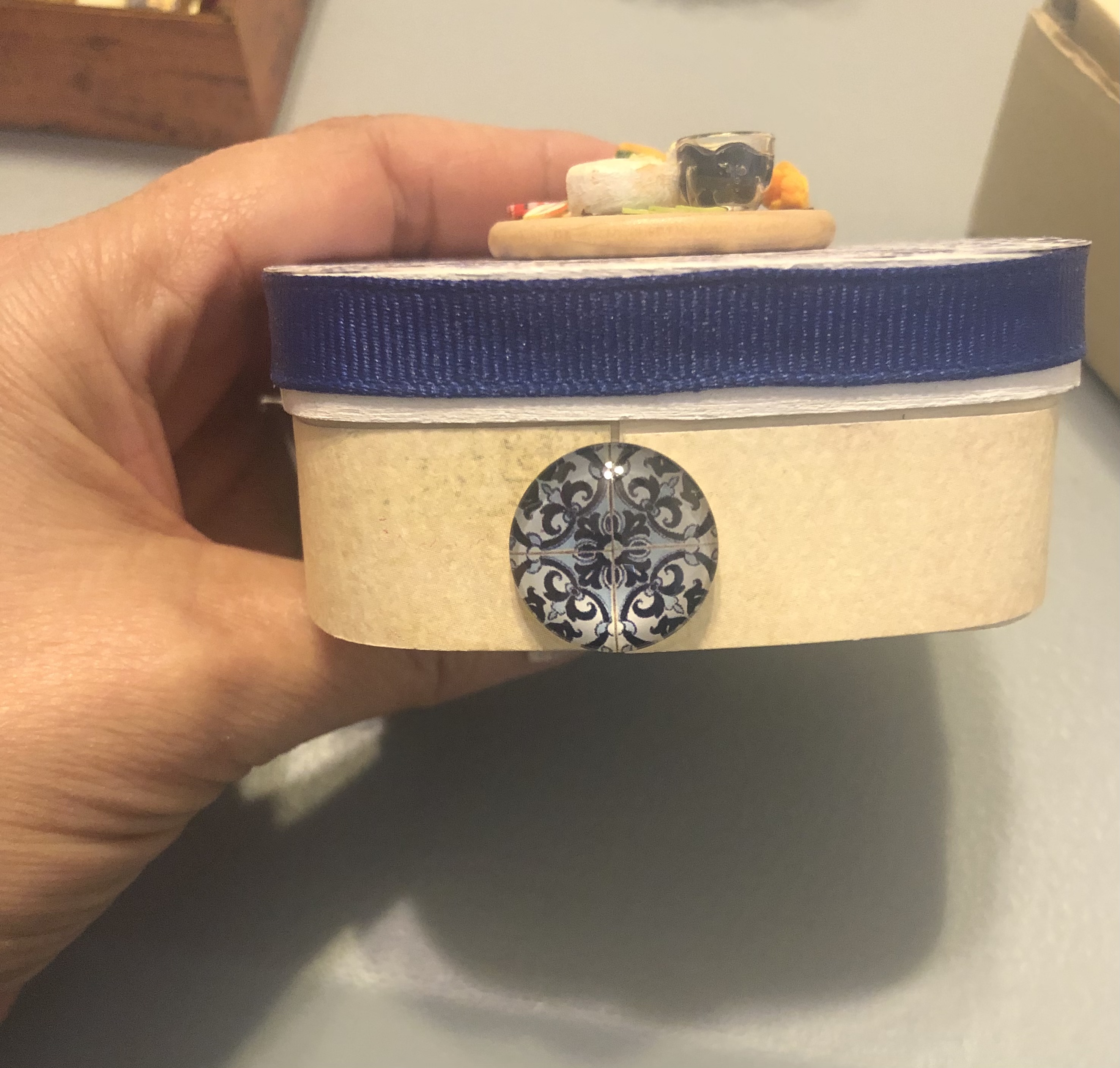 The donuts, yarn, and teeny bottle buttons are a delight. That apothecary cabinet is just phenomenal! Folding and gluing all those drawers must have taken forever! I bet you are already thinking about how to fill each tiny drawer.