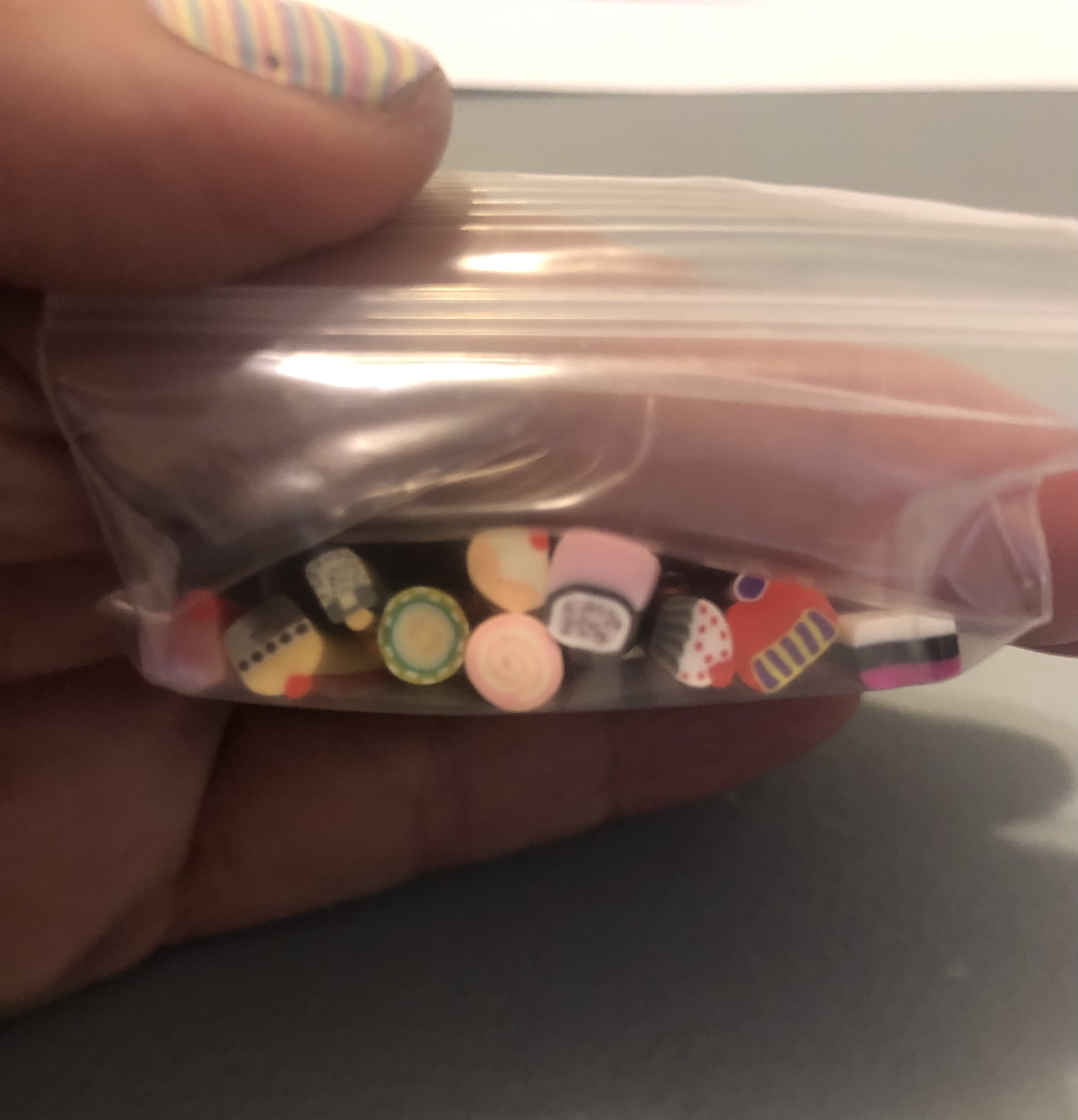 I’m so happy everything arrived intact! Let me share some of my resources if anyone is interested. The fish and glow in the dark duck are from Oriental Trading. A lot of the resin items are vase filler, including the glow in the dark bones. The Spam is made from a dollhouse brick. I just recently discovered resin butterfly nail embellishments. That is also what the poly clay canes are. That book was hard! I don’t have a good tolerance for super fussy stuff. If anyone wants to give it a try, I used a tutorial from Thicketworks Studio.