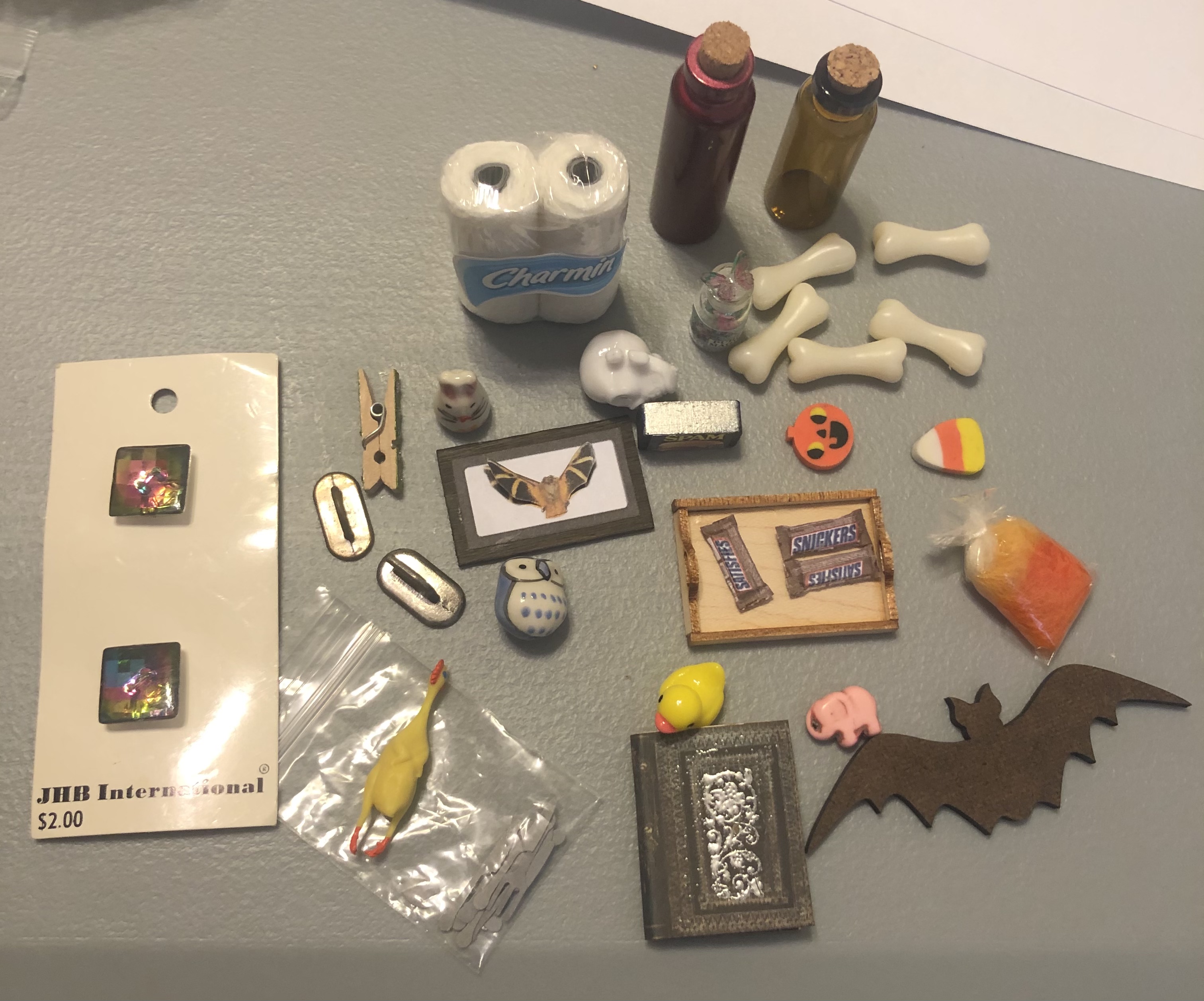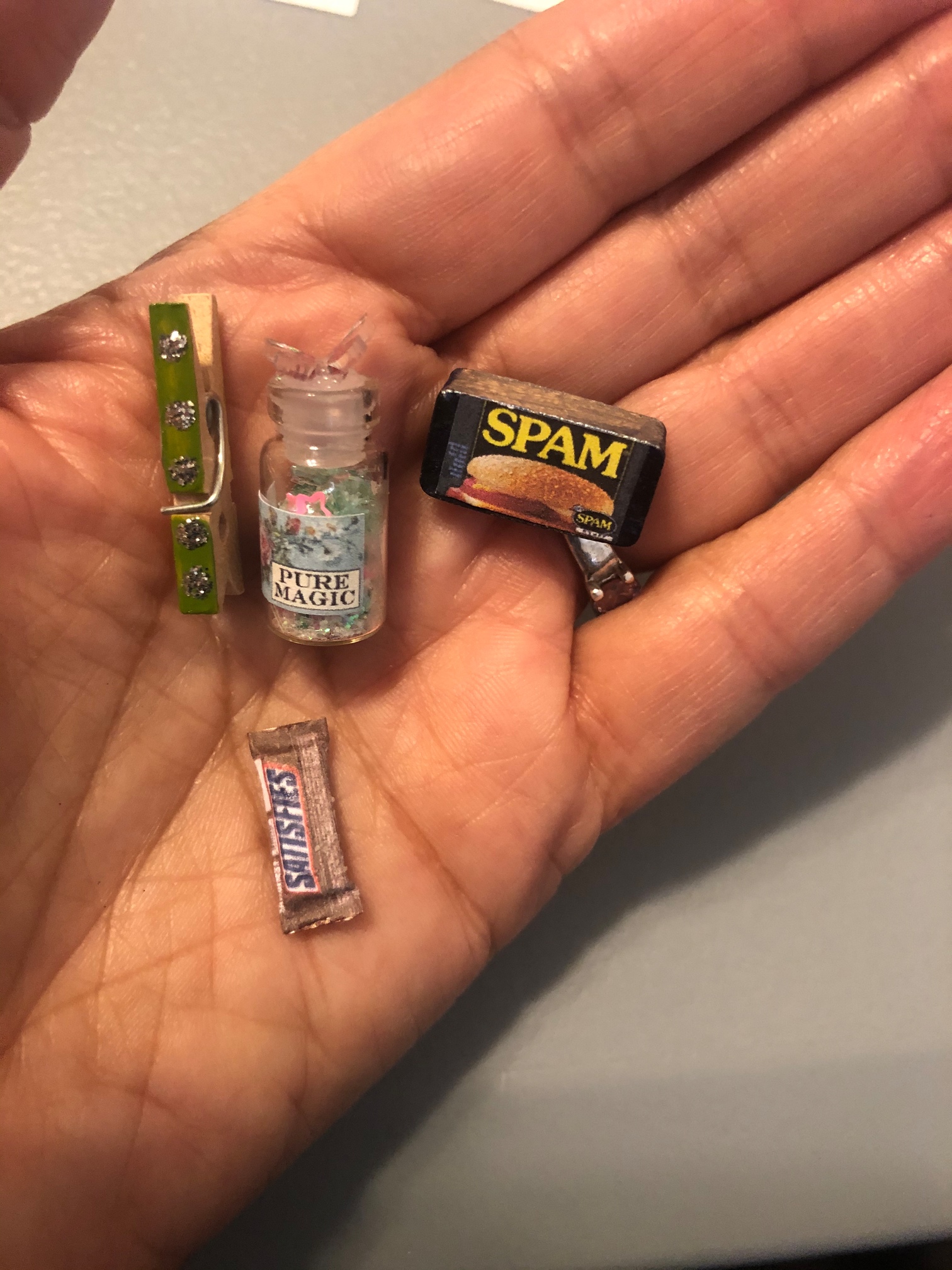 A closeup of some faves! The tiny clothespin is embellished! Ack! The detail!! Look how tiny that Snickers bar is! And the jar of magic! It has the teeniest butterfly on the lid!
