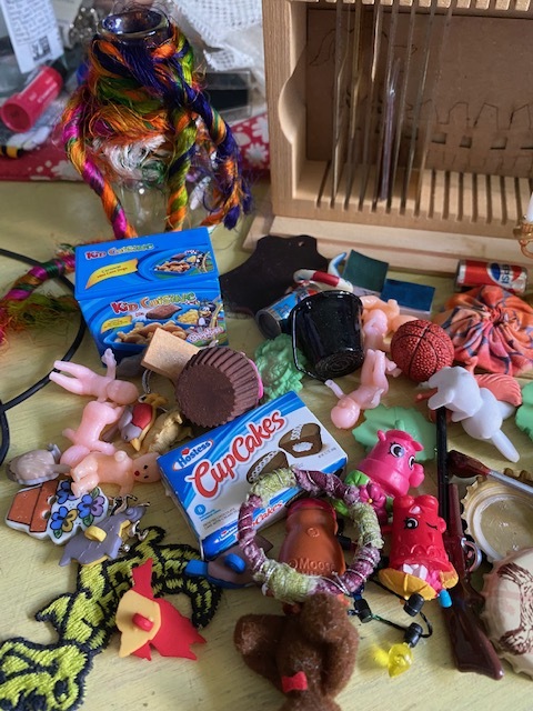 A little treasure chest full of keys and charms, Swiss cheese that looks real, some skeins of wood, a clay pot and a box of donuts!