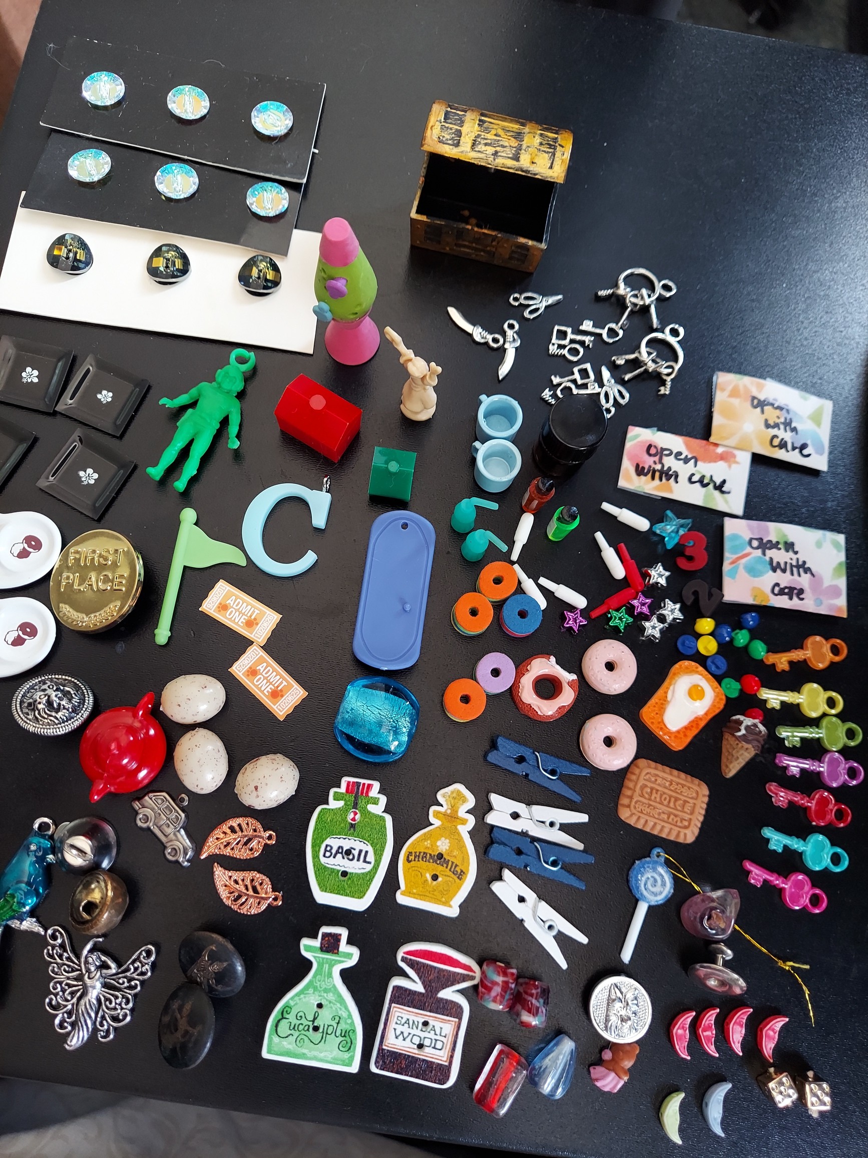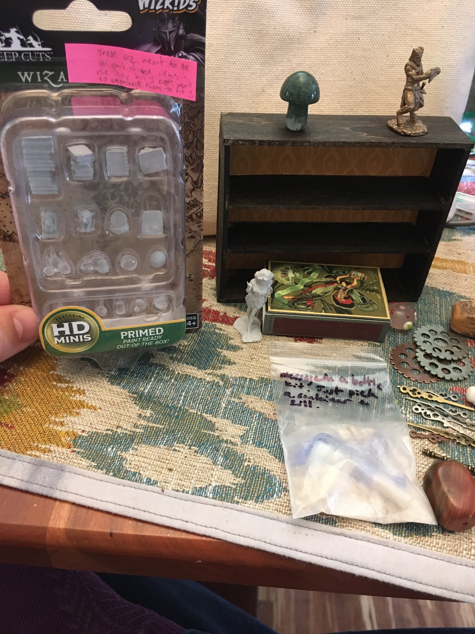 and a lovely bookshelf for my dollhouse, with a satyr sculpture, a cool matchbox, a wish bottle “kit”, an awesome stone mushroom, and some fascinating miniatures to paint. (I am going to have to fight my child for those!)