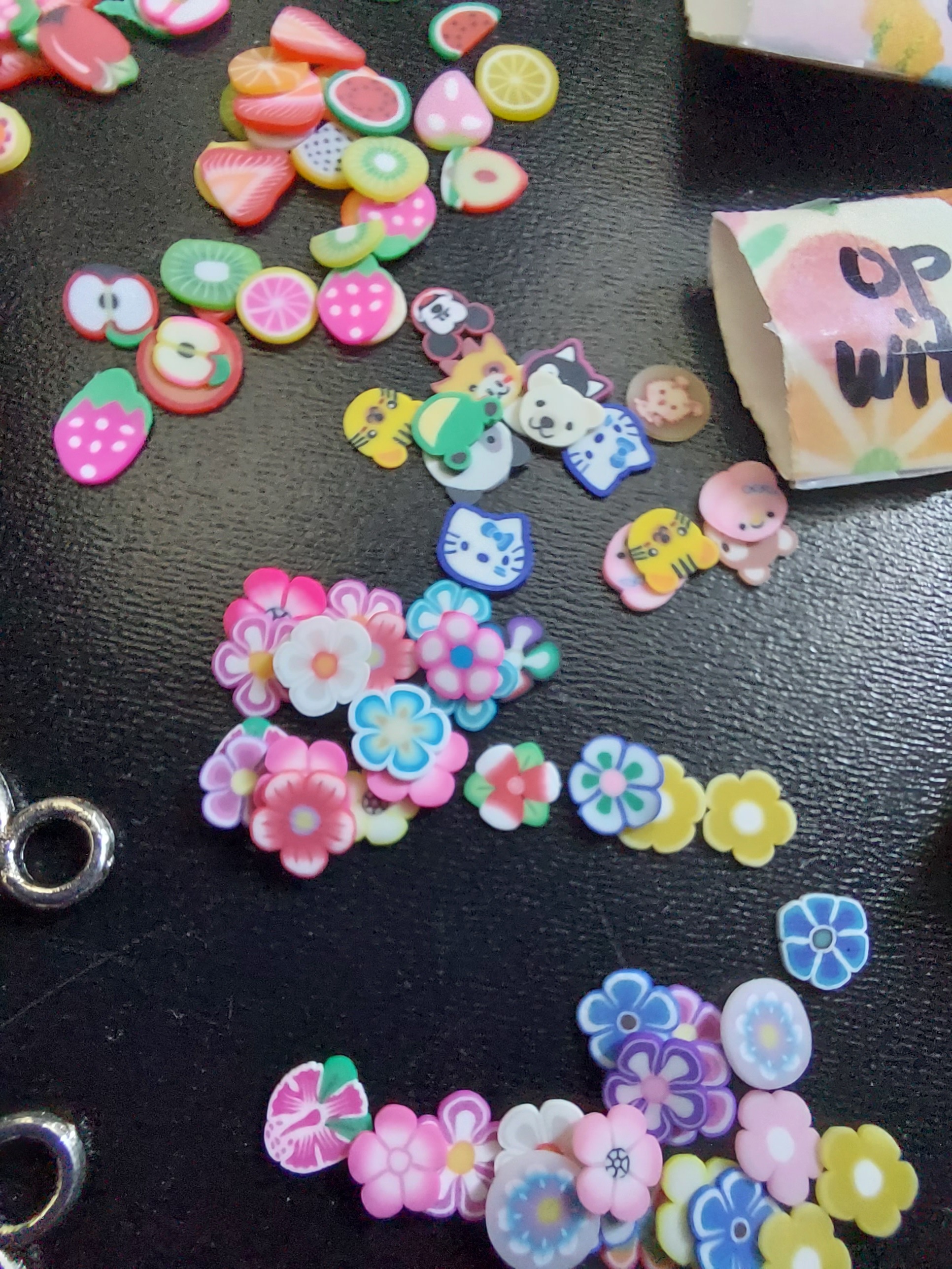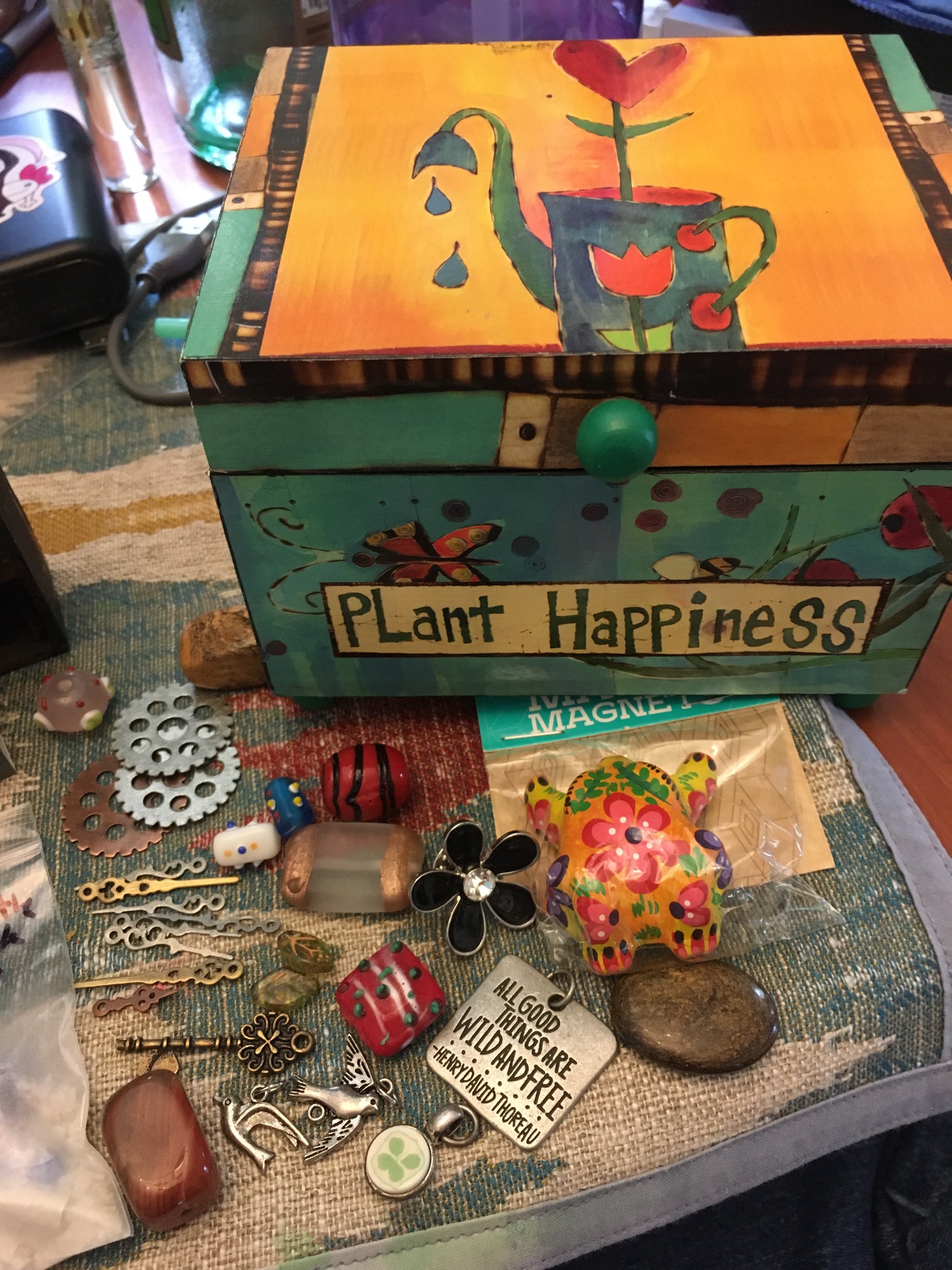 Box: half the inside is a music box compartment which plays “You are my sunshine”, and the other half was full of cool rocks and beads and little metal bits.