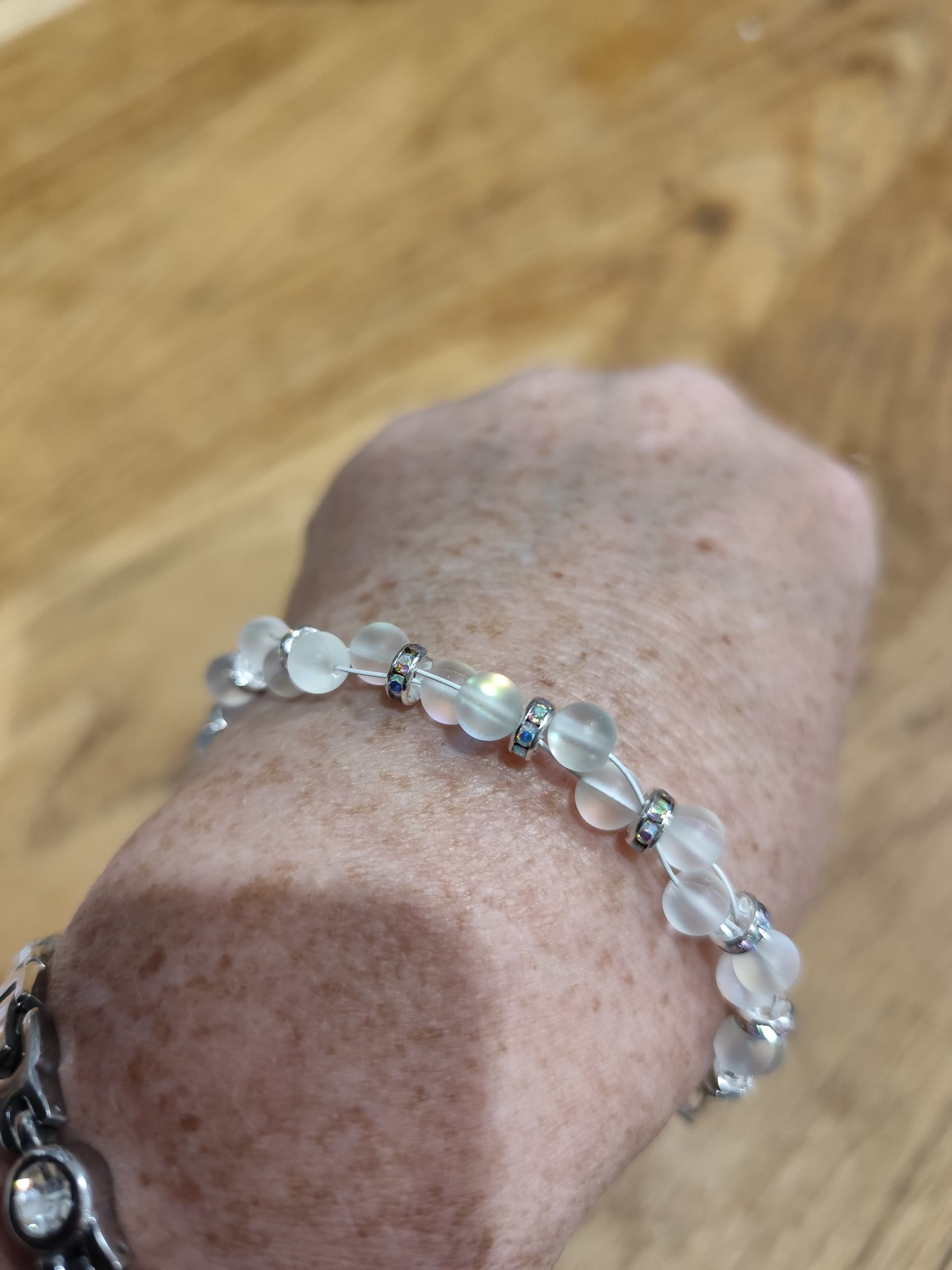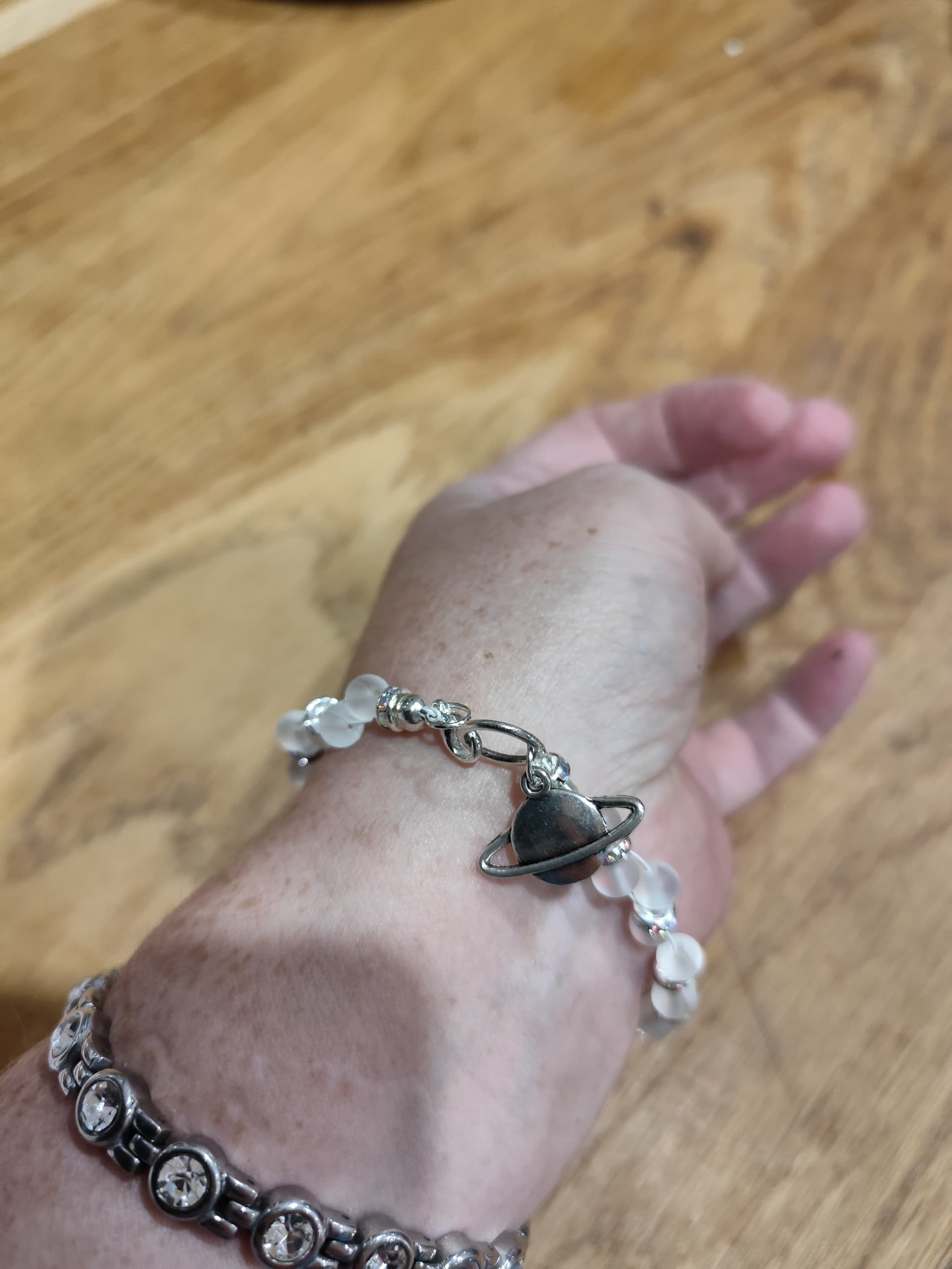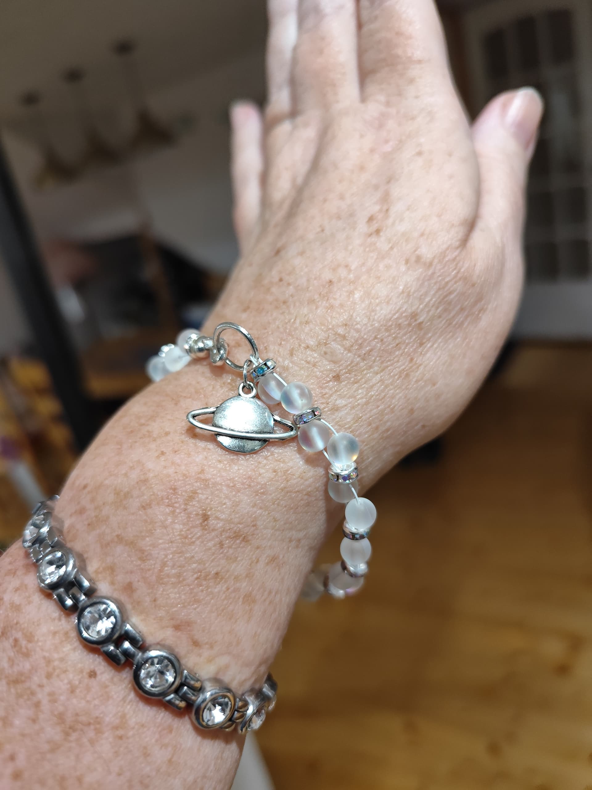 Glass (fake moonstones) rondels, tiger tail and a planet charm for a bit of weight, because all my bracelets rotate on my wrist to have the clasp on top.