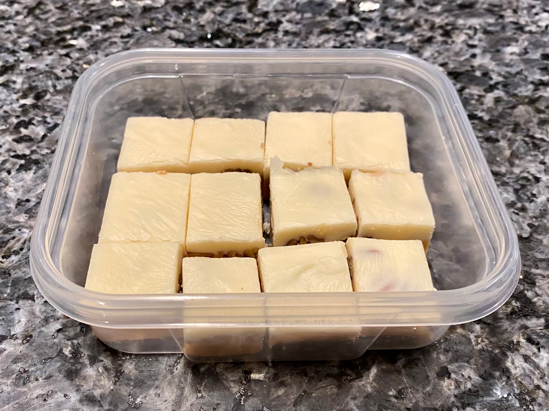 Remove from heat; gradually add the butterscotch and white chocolate chips, ¼ cup at a time, stirring until the chips are completely melted. Stir in nuts and vanilla. Pour into prepared pan; cool.
