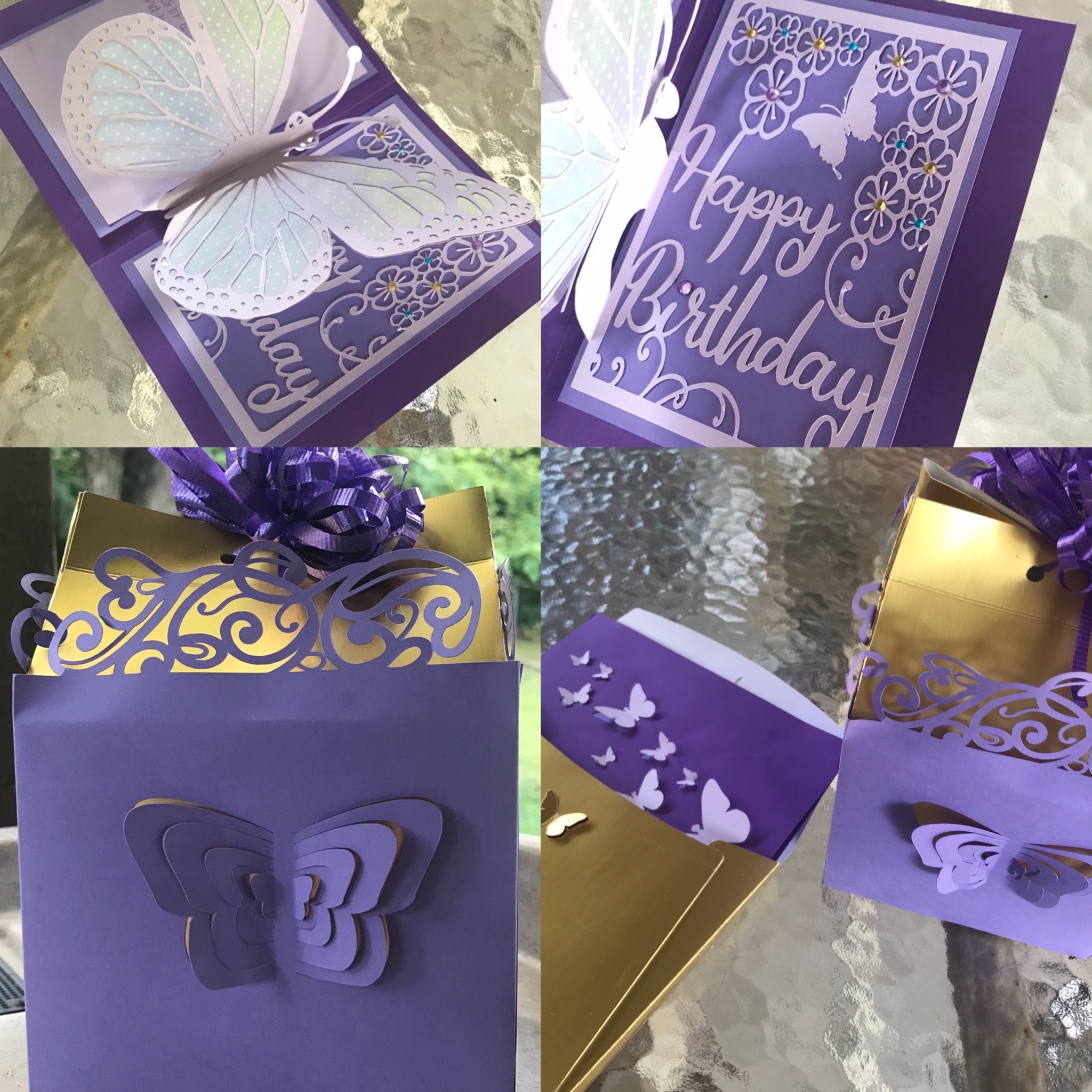 I worked on these last week. Who am I kidding? I worked on it off and on for the past two weeks! I had done the butterfly card for another friend but minus the Happy Birthday message prior and decided I had to have that on there in some way. I was making it for a fellow Cricuteer so I wanted it perfect. Please note that this is the perfected card, I have about ten pieces of reject cuts that I didn’t like!