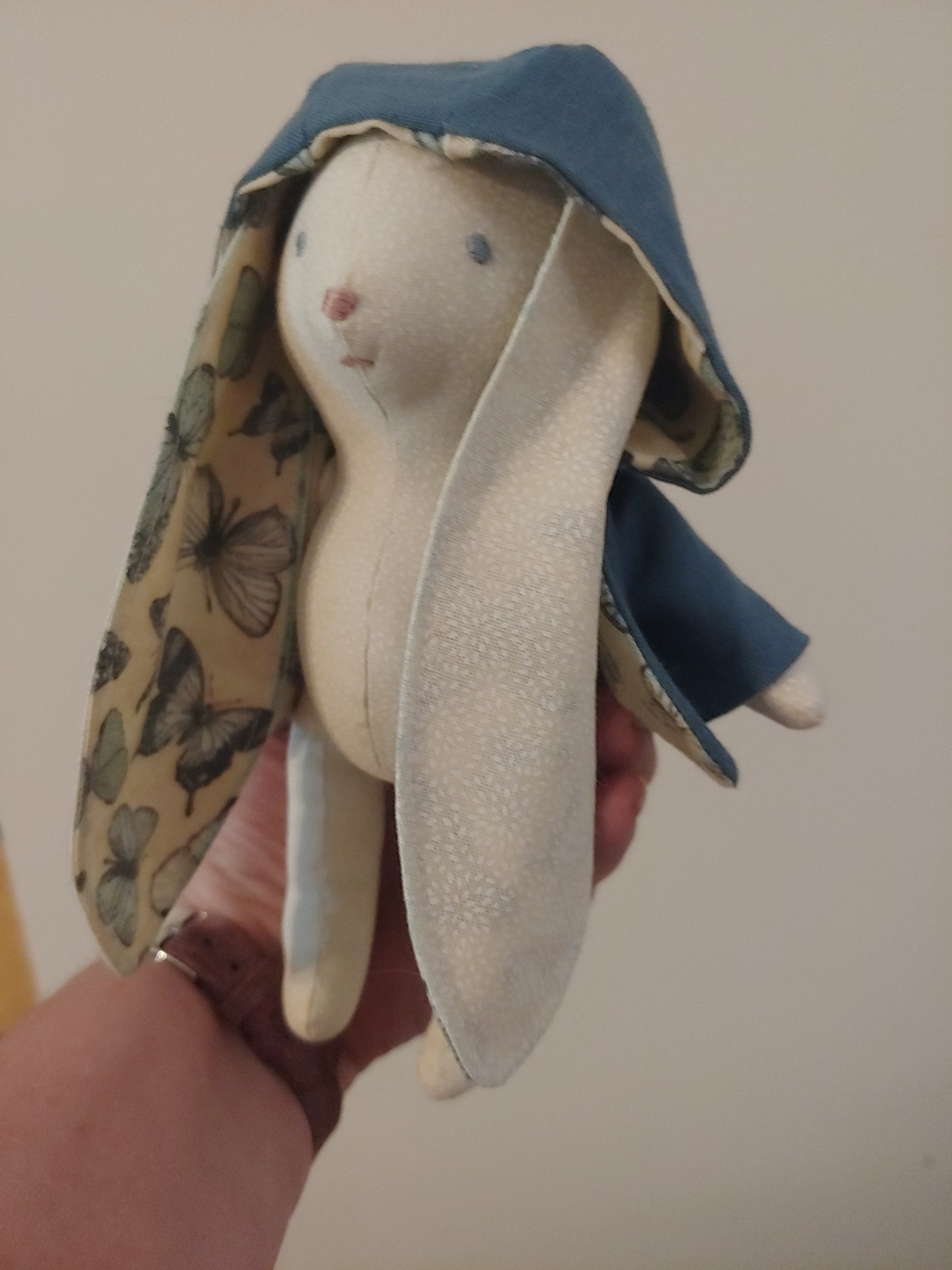 He is so cute! I especially love the fabric choice. That butterfly pattern is perfect for a little spring bunny.