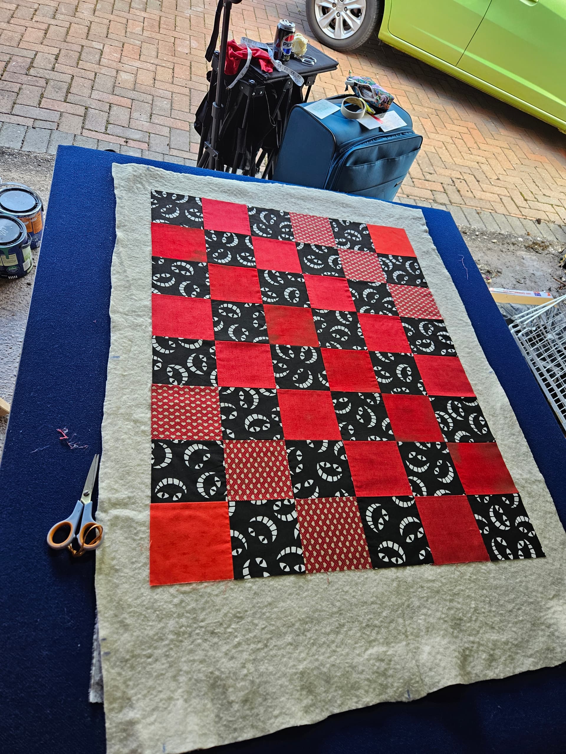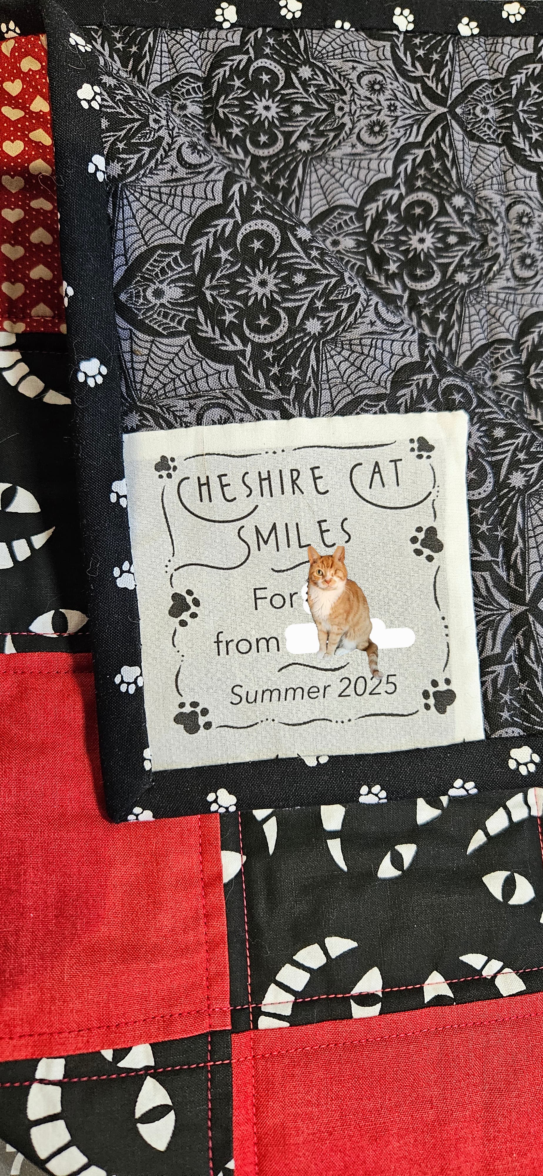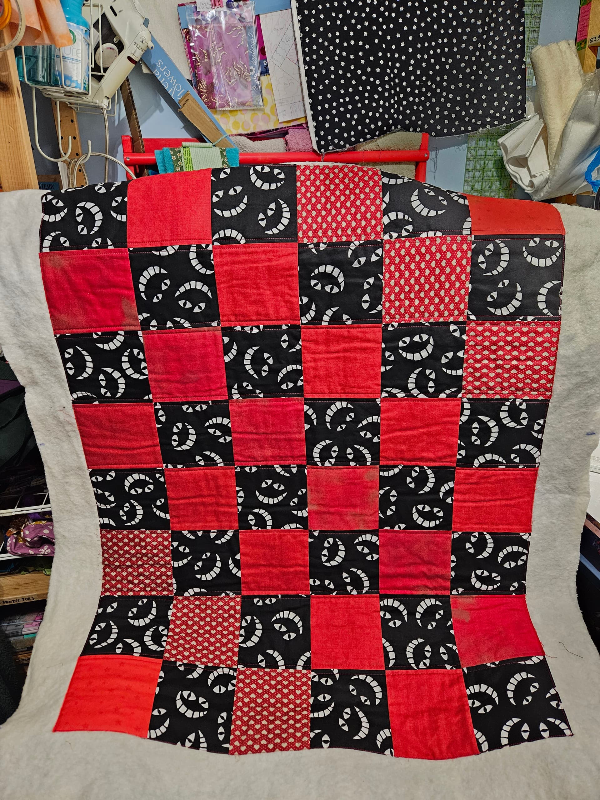 I got the Cheshire Cat fabric from someone on The Other Site, and had used bits, but still had plenty left. My friend’s fave colour combo is red and black. She has bad vertigo, so didn’t want a complex pattern. She really liked the hearts fabric, which I had used on one of my clothing bags, but I only had enough left for 6 squares, so I built the layout around using those 6 squares in logical places.