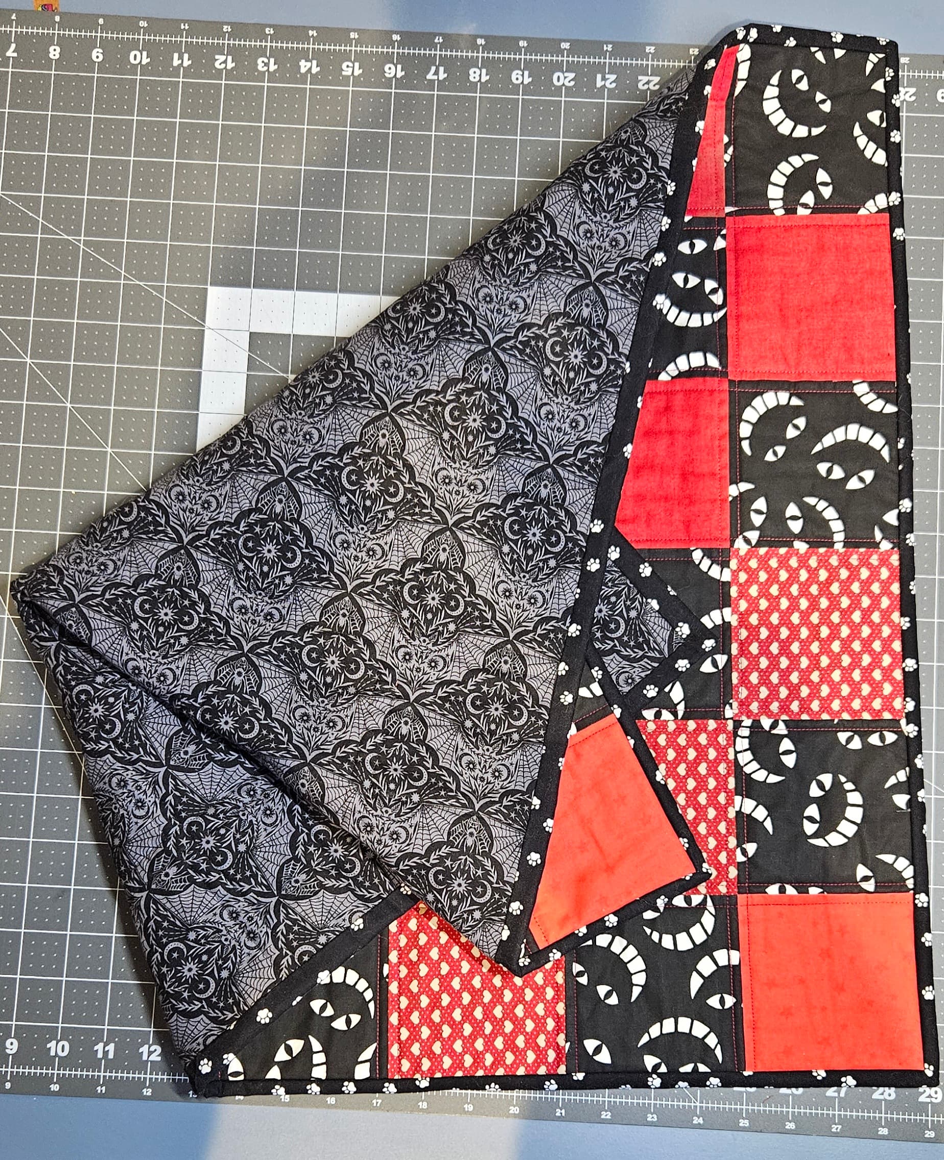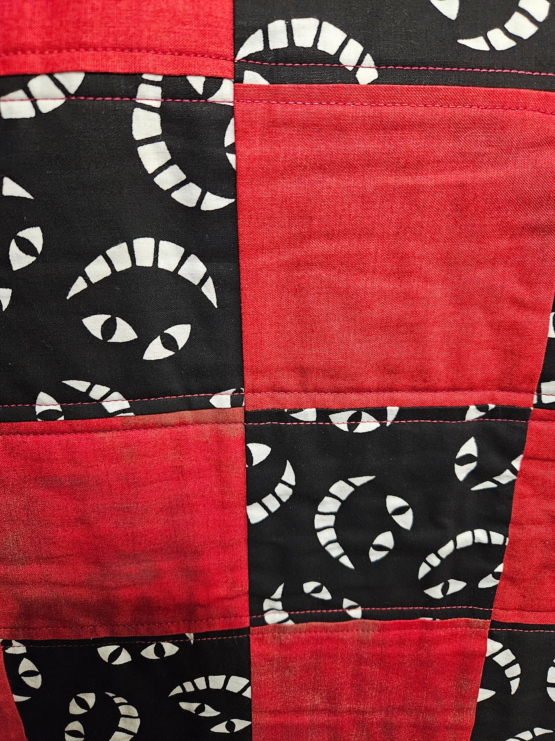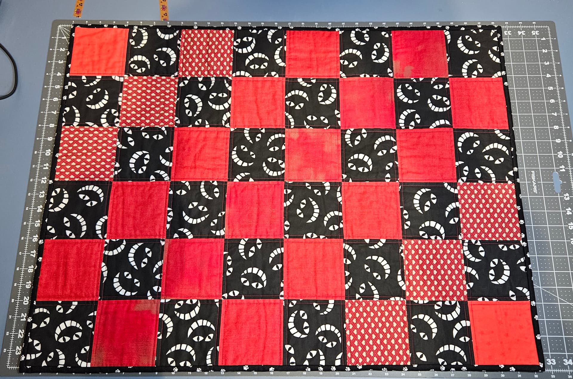 I got the Cheshire Cat fabric from someone on The Other Site, and had used bits, but still had plenty left. My friend’s fave colour combo is red and black. She has bad vertigo, so didn’t want a complex pattern. She really liked the hearts fabric, which I had used on one of my clothing bags, but I only had enough left for 6 squares, so I built the layout around using those 6 squares in logical places.