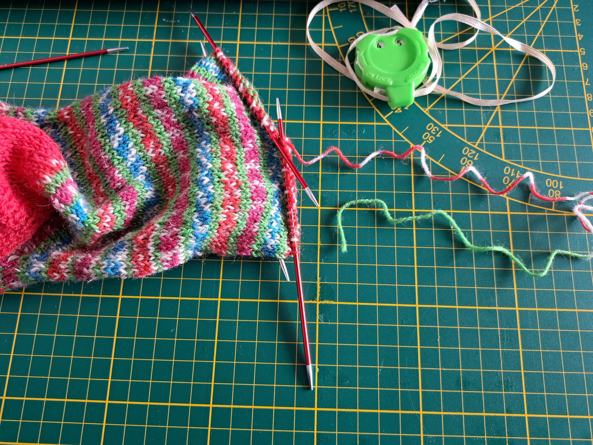 The yarn is West Yorkshire Spinners Signature, the striped one is called fairy lights and has a bit of a sparkle, and the solid is called cayenne pepper I think. I used the matching free pattern and it was a bit of a hassle, it’s a plain vanilla sock still but the pattern is a bit annoying to read. Next time I would just use my regular pattern (a King Cole freebie). There’s a lot of the red yarn left over, but that’s a useful colour to have in stash, I will use that up eventually.