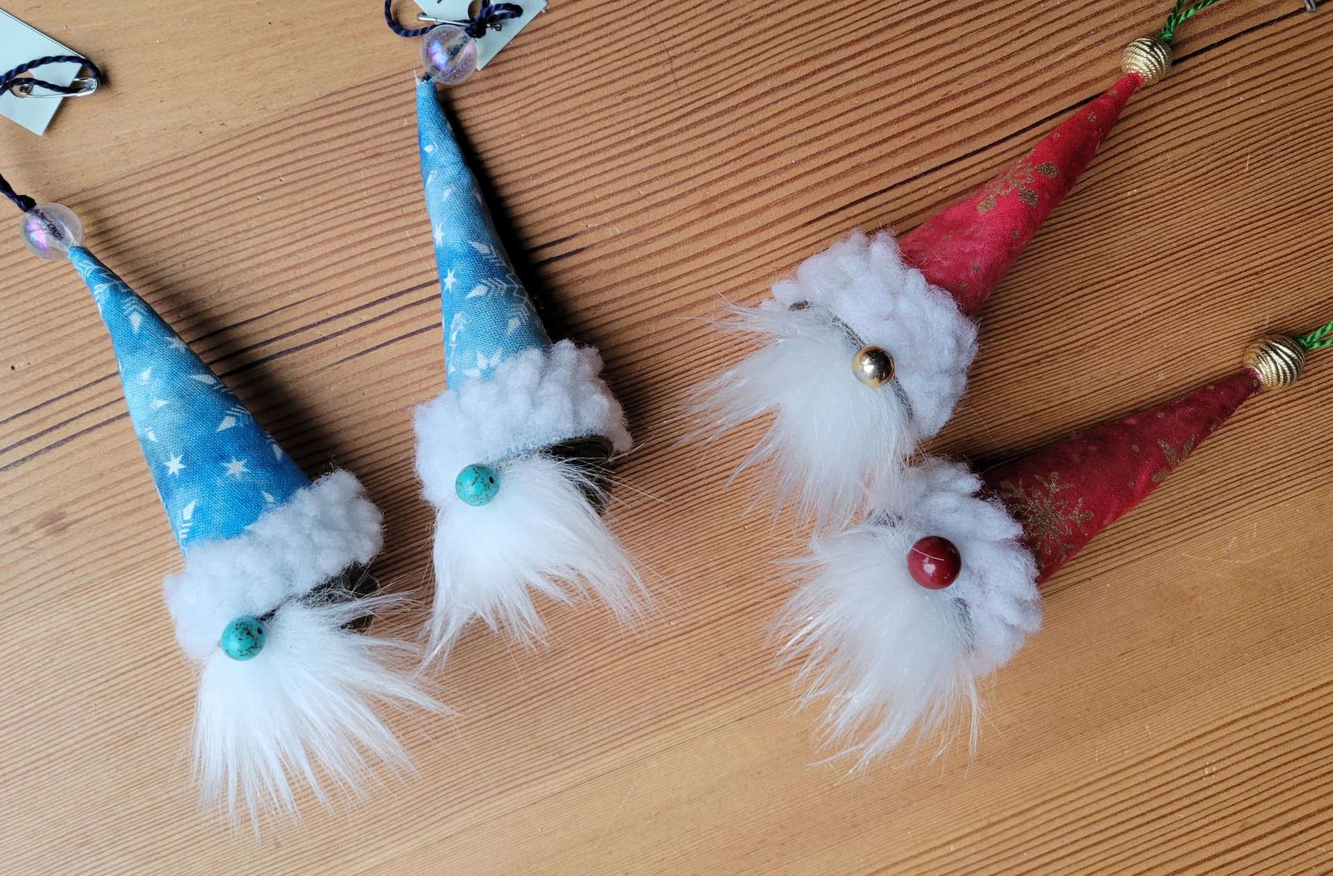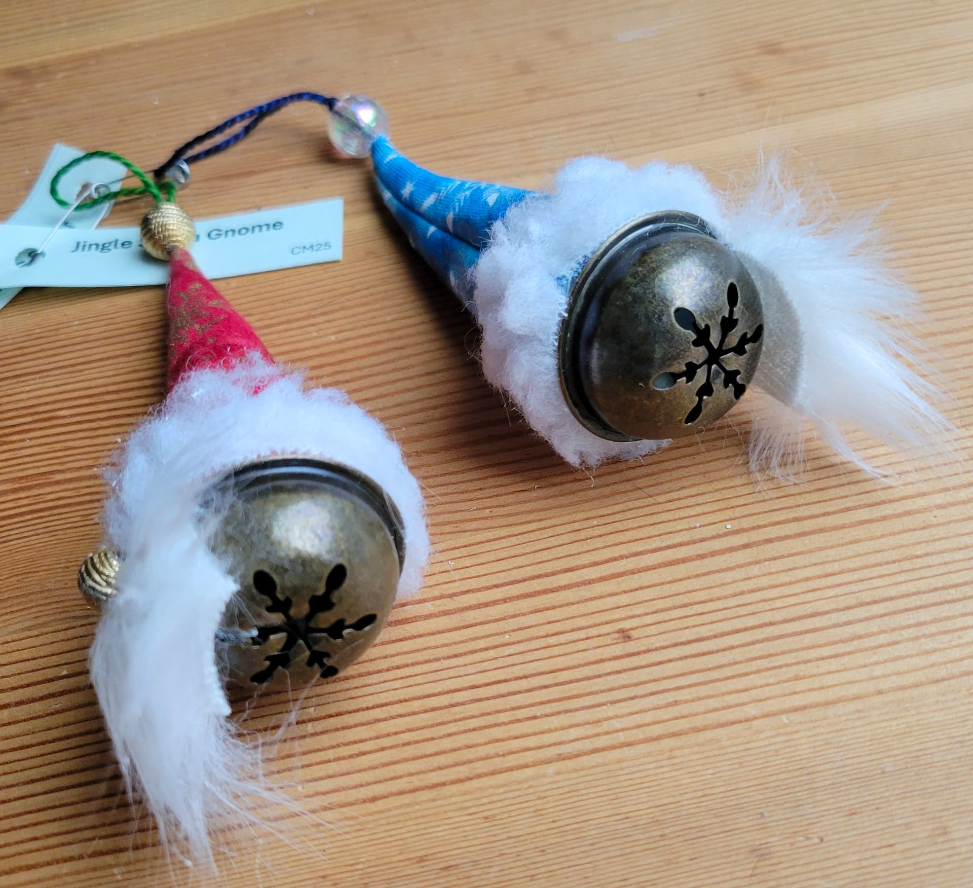 Jingle Santa Ornaments: I used an antiqued bell and added a hat, beard, and bead nose. A bit fussy to figure out, and I’m a demon with glue, but they came out cute.
