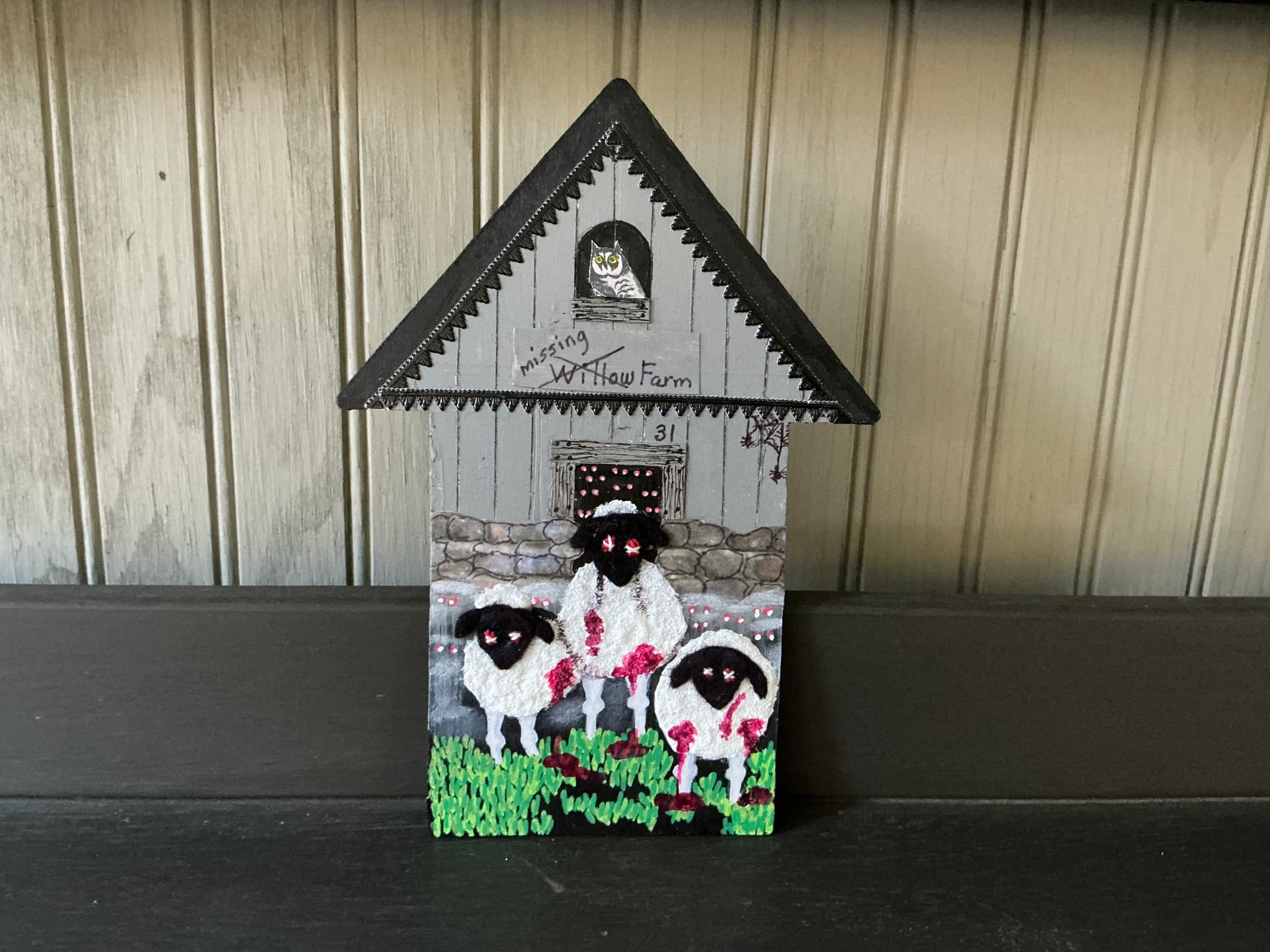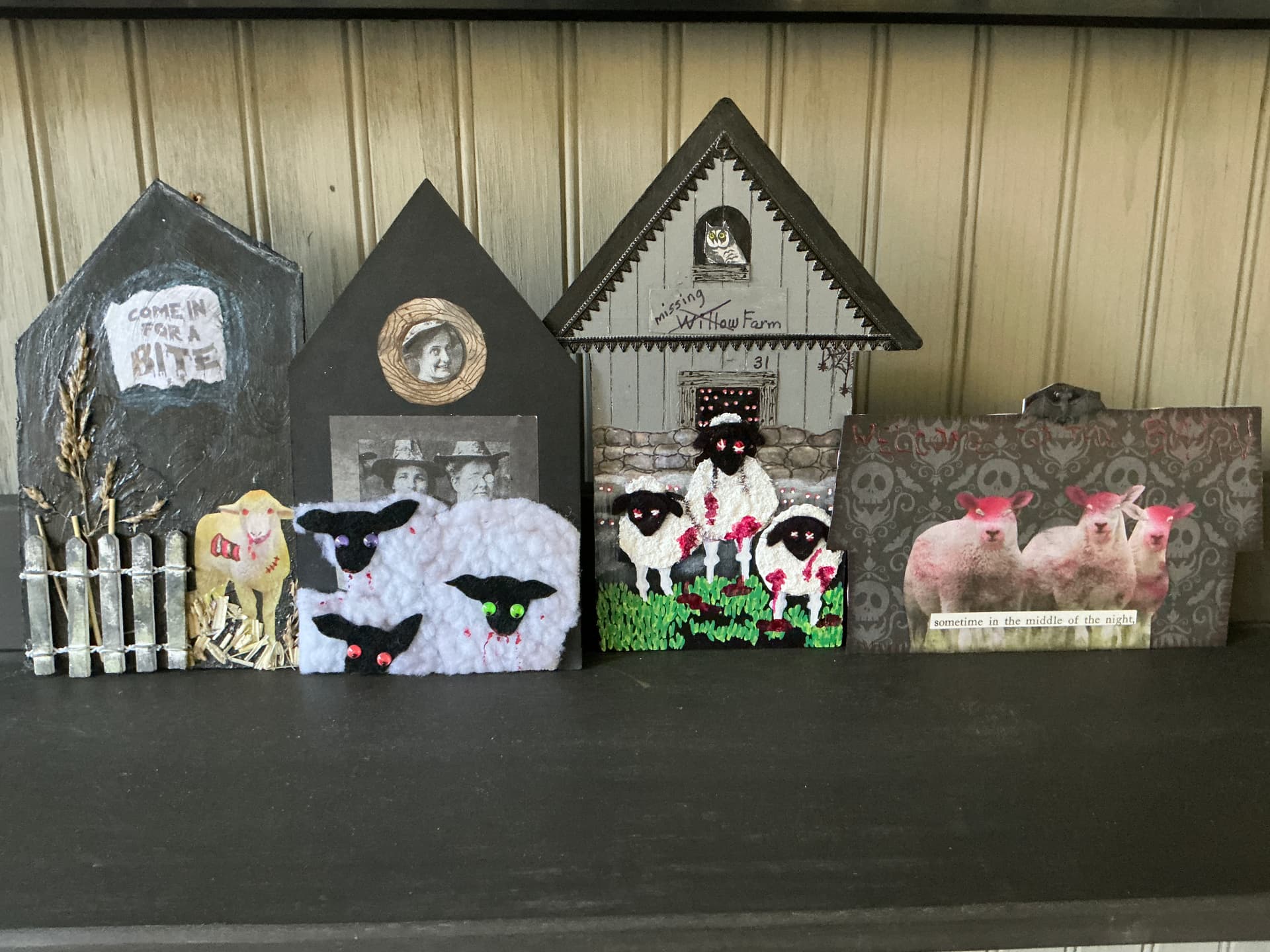 And here is a shot of it residing with some of the other zombie sheep houses I’ve received over the years.