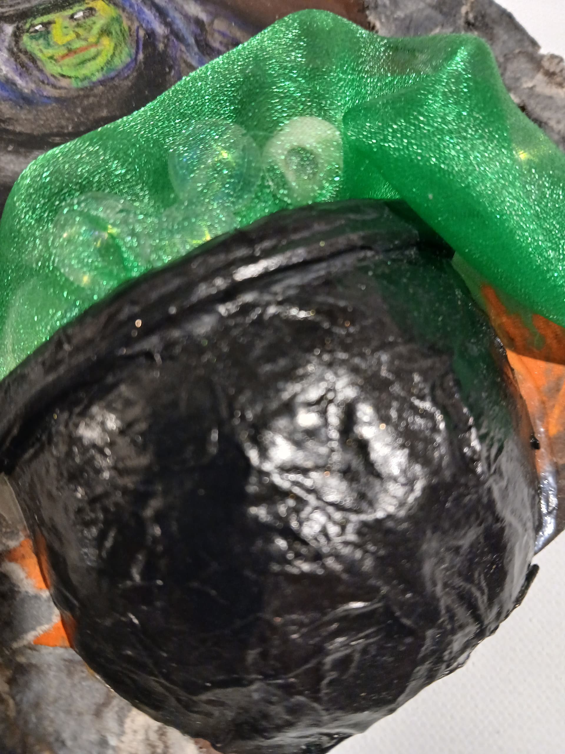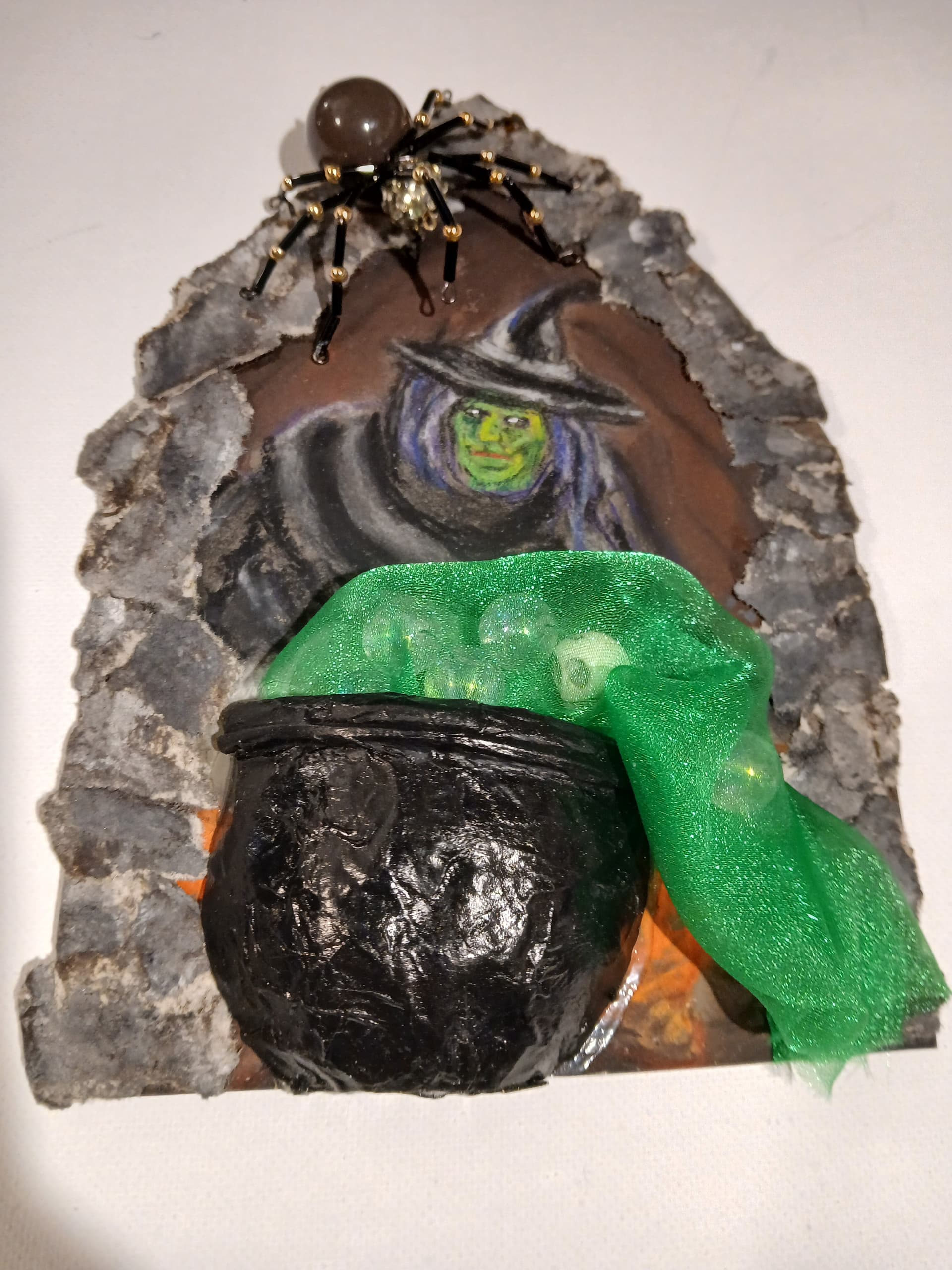 Brilliant using the green fabric to mimic acrid cauldron funk. I’m a bit envious of the witch’s sweet purple hair, but she looks inhuman with the pupil-less eyes. Devoid of emotion for others.