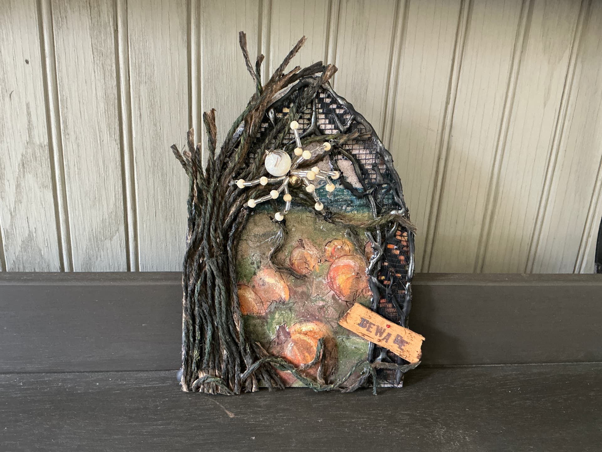 Prepare to be super jealous… @marionberries included one of her beaded spiders in the house she sent, isn’t this fantastic?! The gnarled trees appear to be stiffened thick twine painted black, is that right? It’s going to be a great addition to my neighborhood. Thank you SO much for this little treasure!