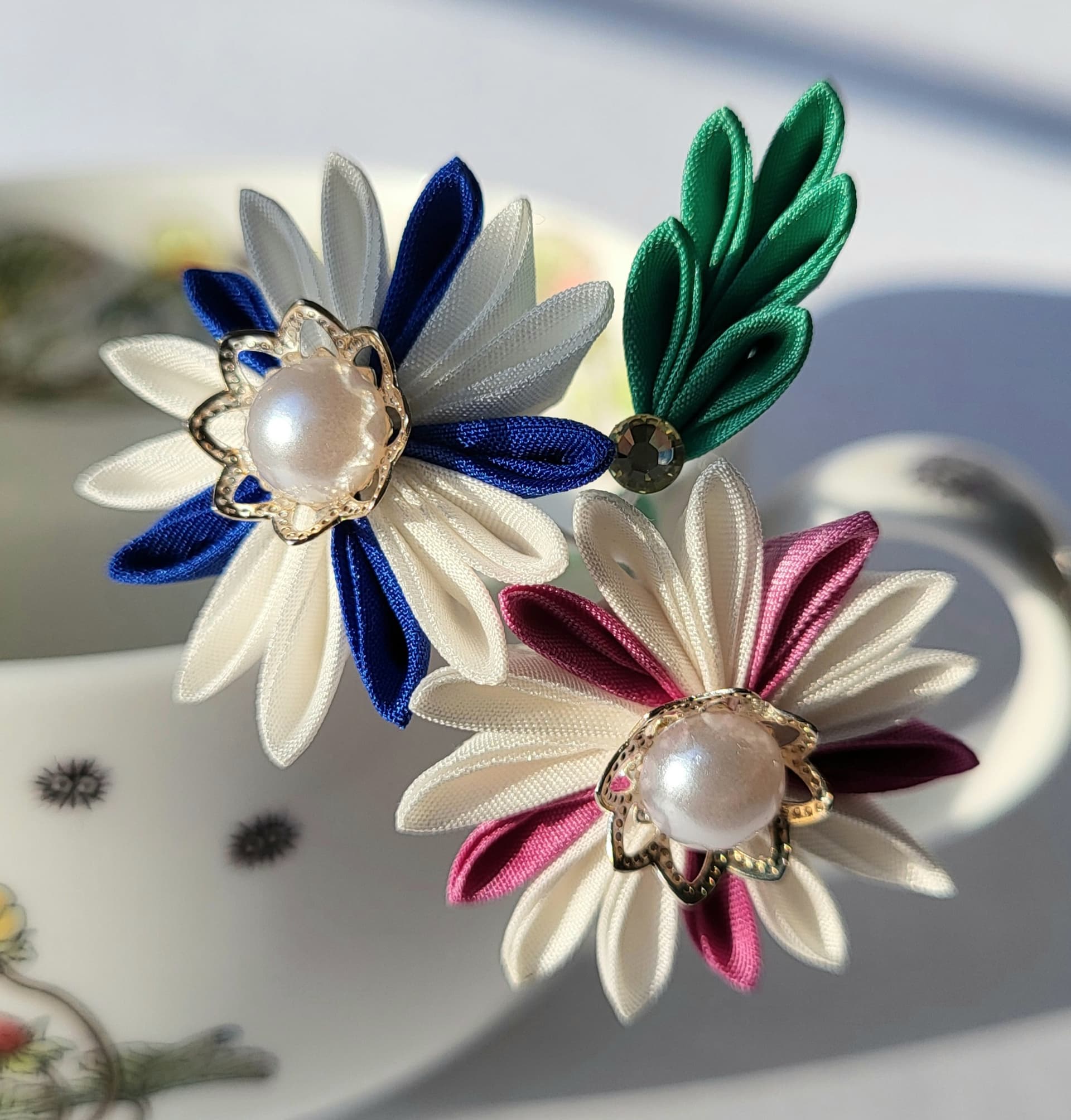Clematis is one of those flowers that has a million different variations. But, this is the way that I’ve represented them most often in my tsumami-zaiku practice - white and pink or white and blue with a star shaped pattern.