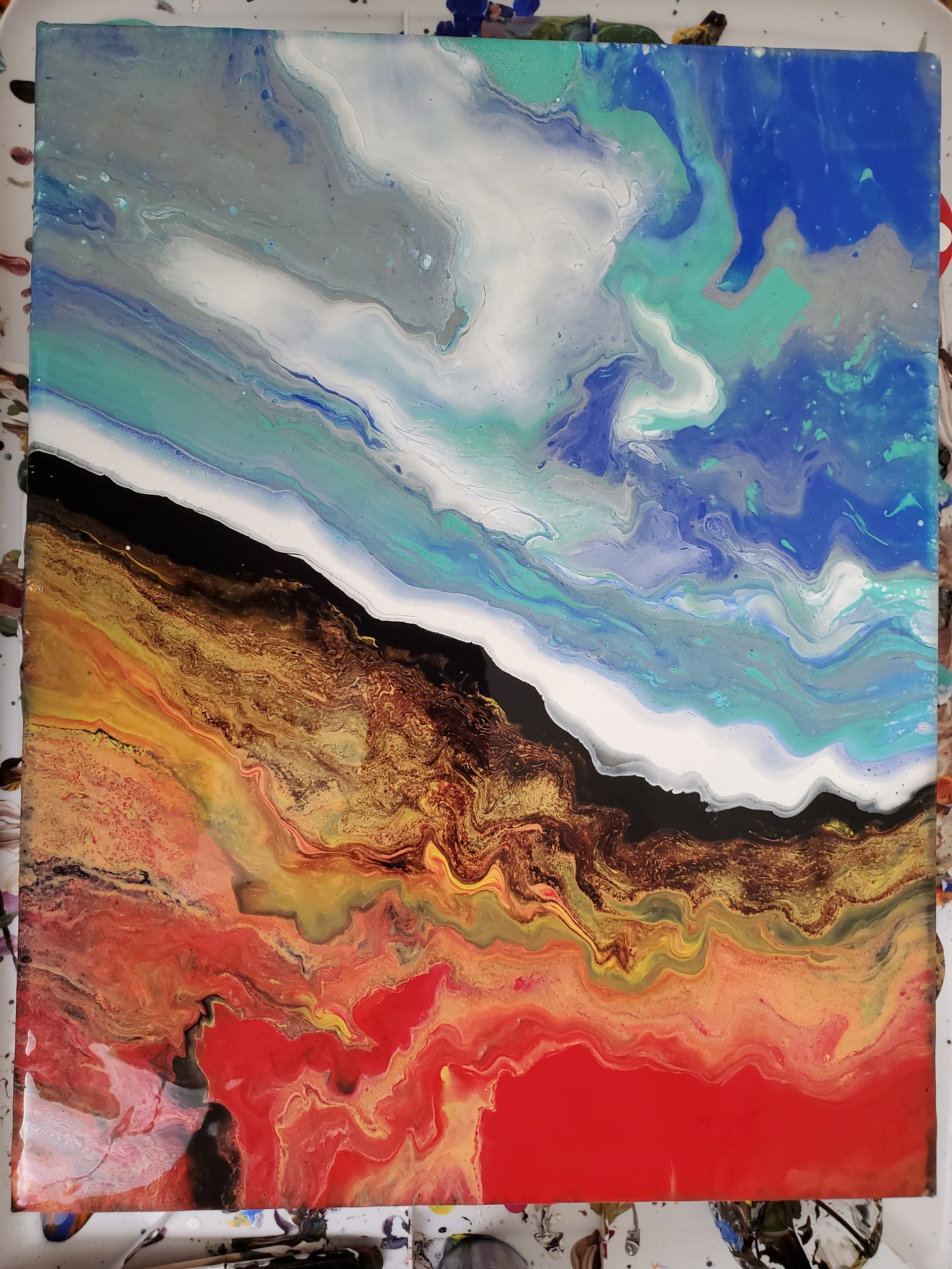 Itβs pouring. I used 2 open cups. Was going for fire and ice, but got this and am thrilled with it. It will be going up op my wall.