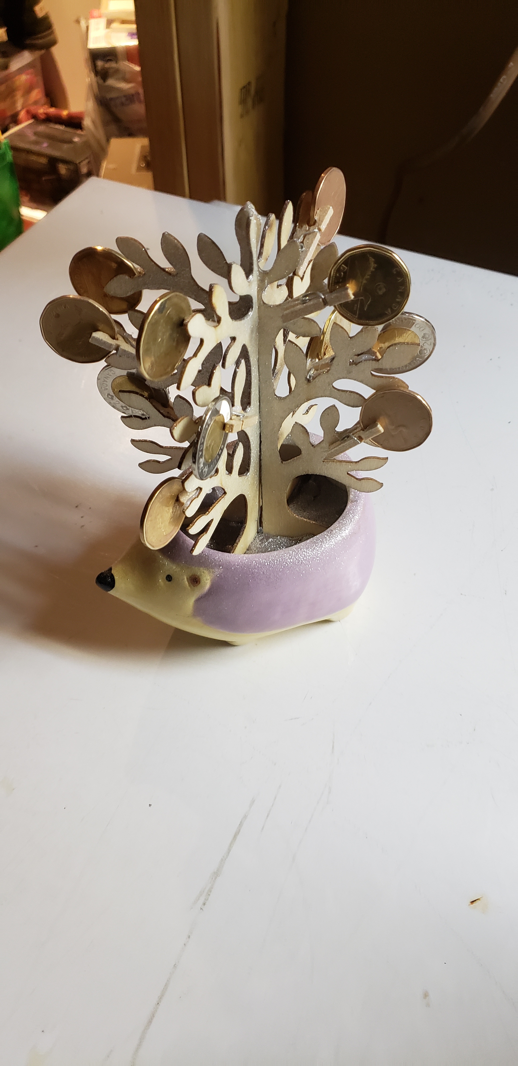Brief Description: created this little money tree, it matched the purple bedding I did with the little purple hedgehog. 3 layers of coins on the tree (coin because our smallest paper denomination is $5, and I typically spend ~$25 on birthdays, so it’s a $15 tree and all her favourite snacks-she’s 14)