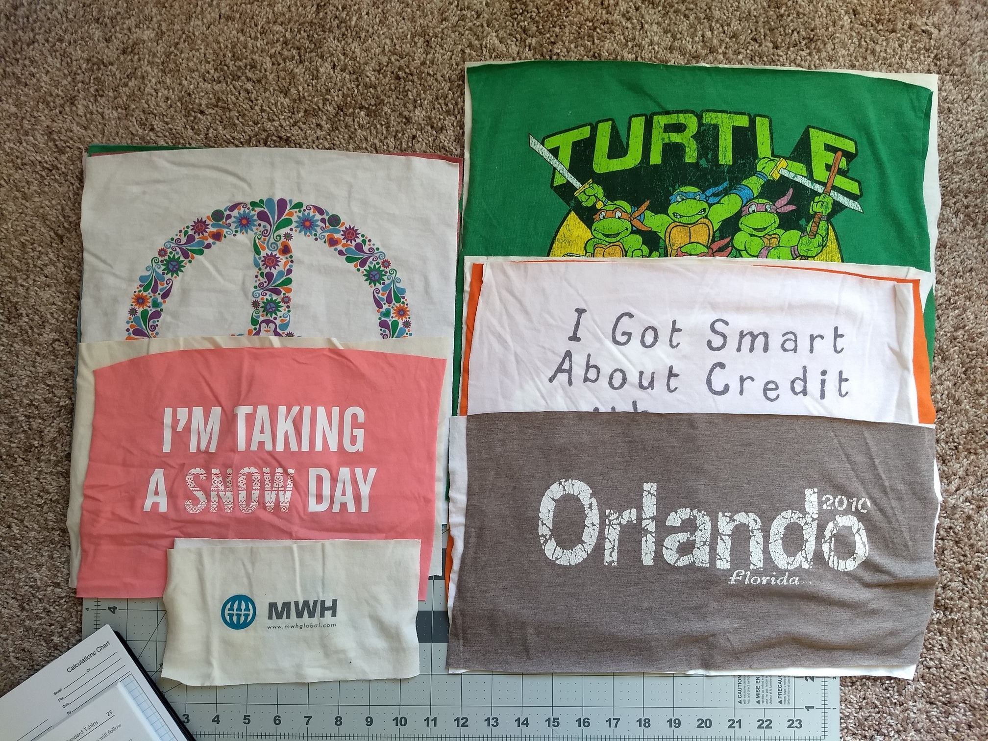 I had all of my sewing stuff out, so I finally cut up some t-shirts for my t-shirt quilts! I still have a few left, but theyāre either plain (so Iāll cut them later when I know what size blocks I need to fill in spaces) or they need to be dyed first.