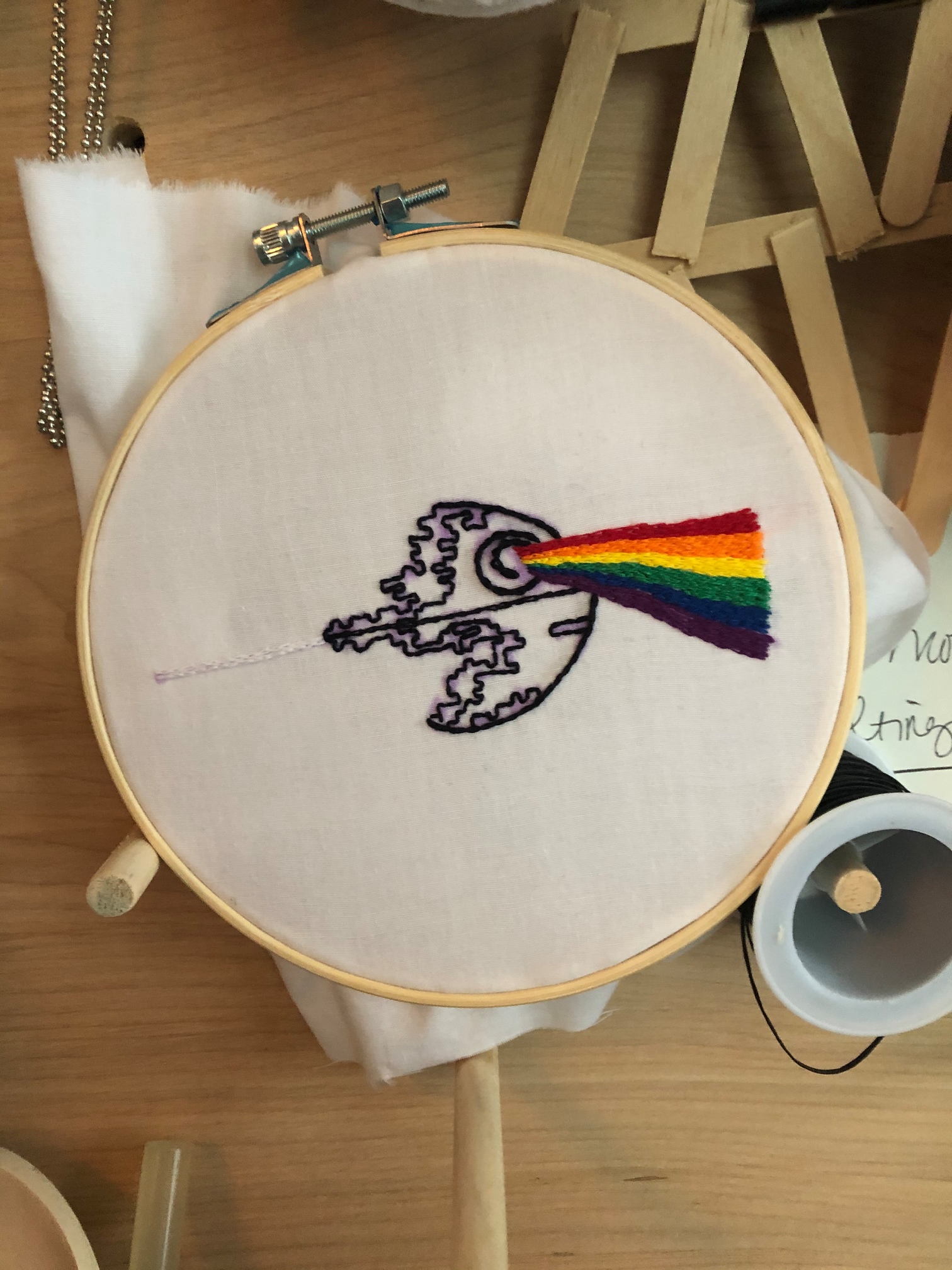Brief Description: Inspired by my geeky love for Star Wars, I stitched up the death star channeling its inner Pink Floyd.