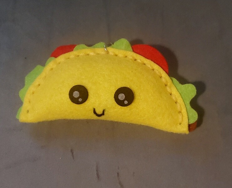 Brief Description: Made a felt taco, too. Has multiple colors, shapes, and parts. He’s got a clip so he can hang off a bag (or maybe be a huge keychain, lol).