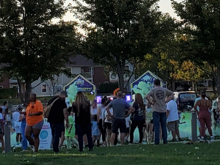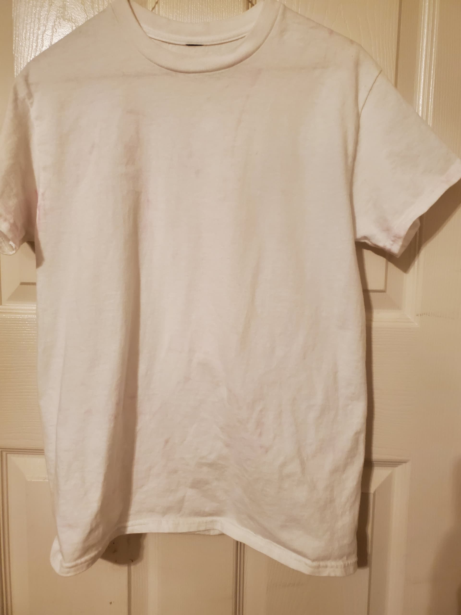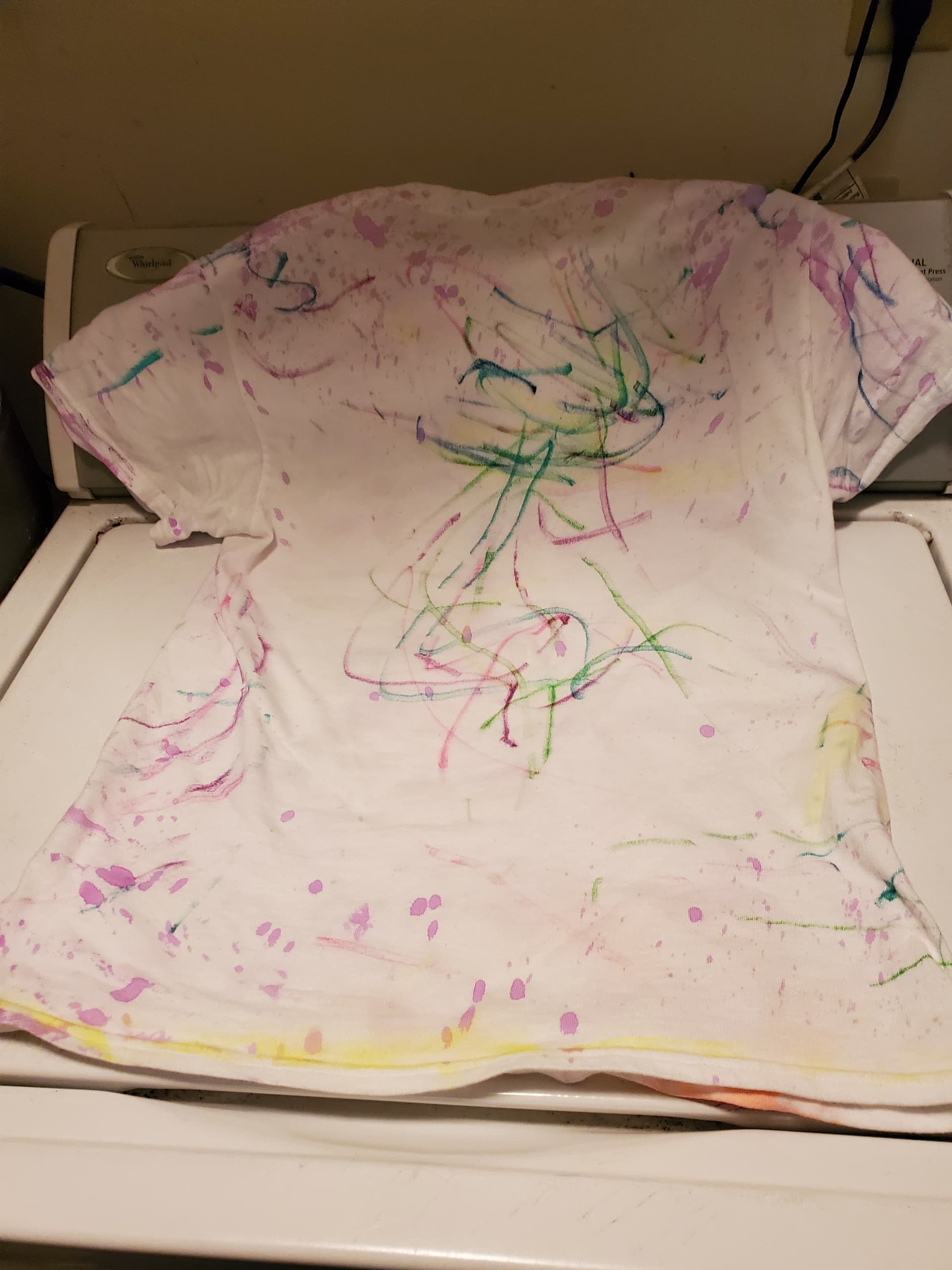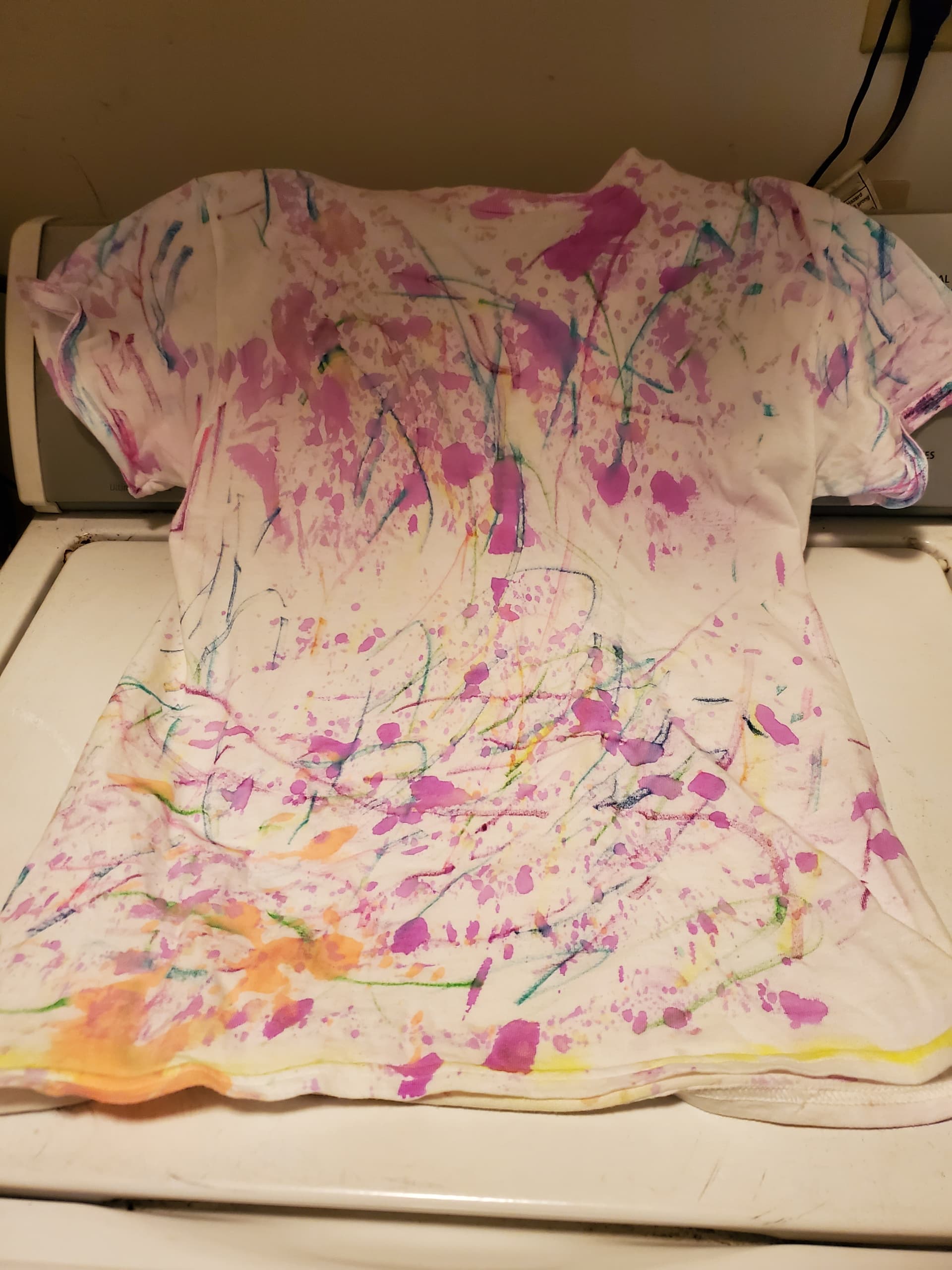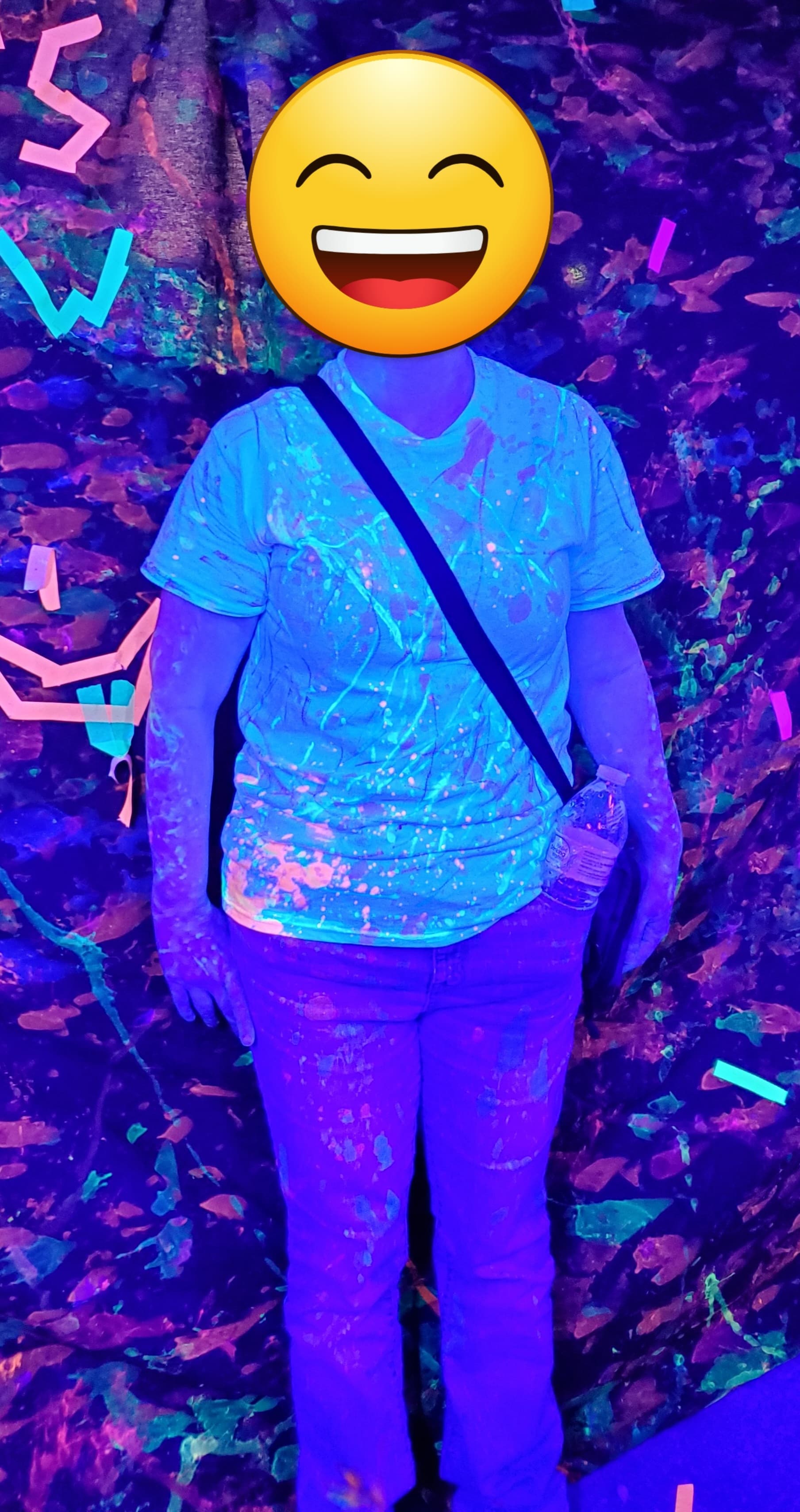 Prompt: Zap 5 Team: Cabin Finger Painters Project Name: Glow in the Park shirt Project Link: N/A Brief Description: The parks department put on a Glow in the Park event. You’re encouraged to wear white/neon (for blacklight purposes), so I wore a cheap white T-shirt from Michaels and streaked it with highlighters at the event decorating station. That’s my actual crafting here. Then for the main event they basically fired paint out of giant syringes (for lack of a better description) from the stage. Project Photo: My final shirt after the whole event. You can tell I was decorating it while wearing it because of how the streaks on the back are concentrated .