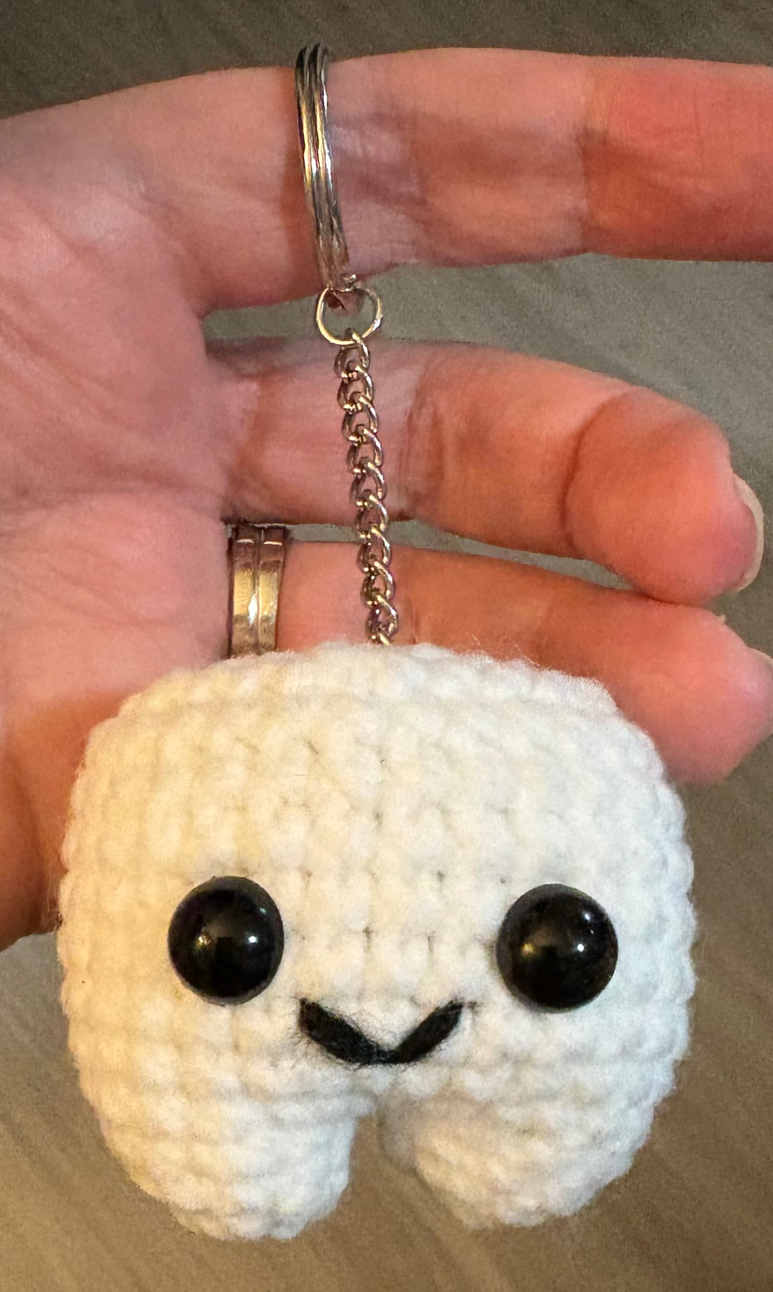 Prompt: August - mess hall Team: cabin finger painters Project Name: tooth keychain Project Link: Brief Description: I had to have a molar extracted a few weeks ago, so I made this for my oral surgeon. I’ll give it to him on my follow up later this week. I went with mystery casserole because it sure would be startling to find a tooth in your food! Project Photo(s):