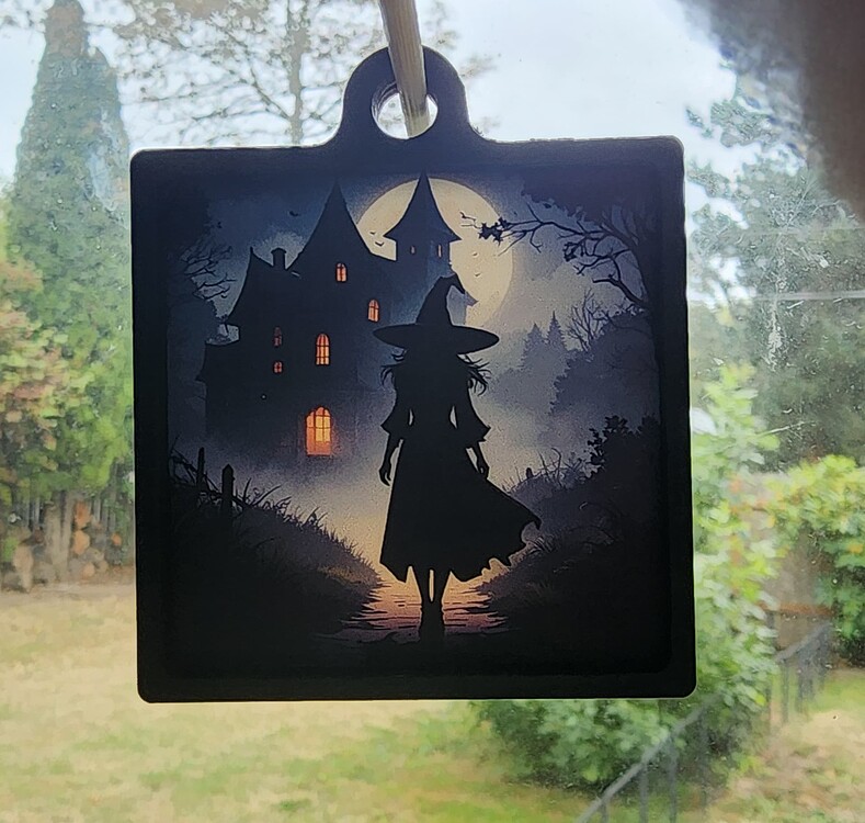 Brief Description: These are witchy windows ornaments. The acrylic is pre-printed, so I’m just following the sizing, but I like how they came out. The frames are 2-sided laser cut and painted black.