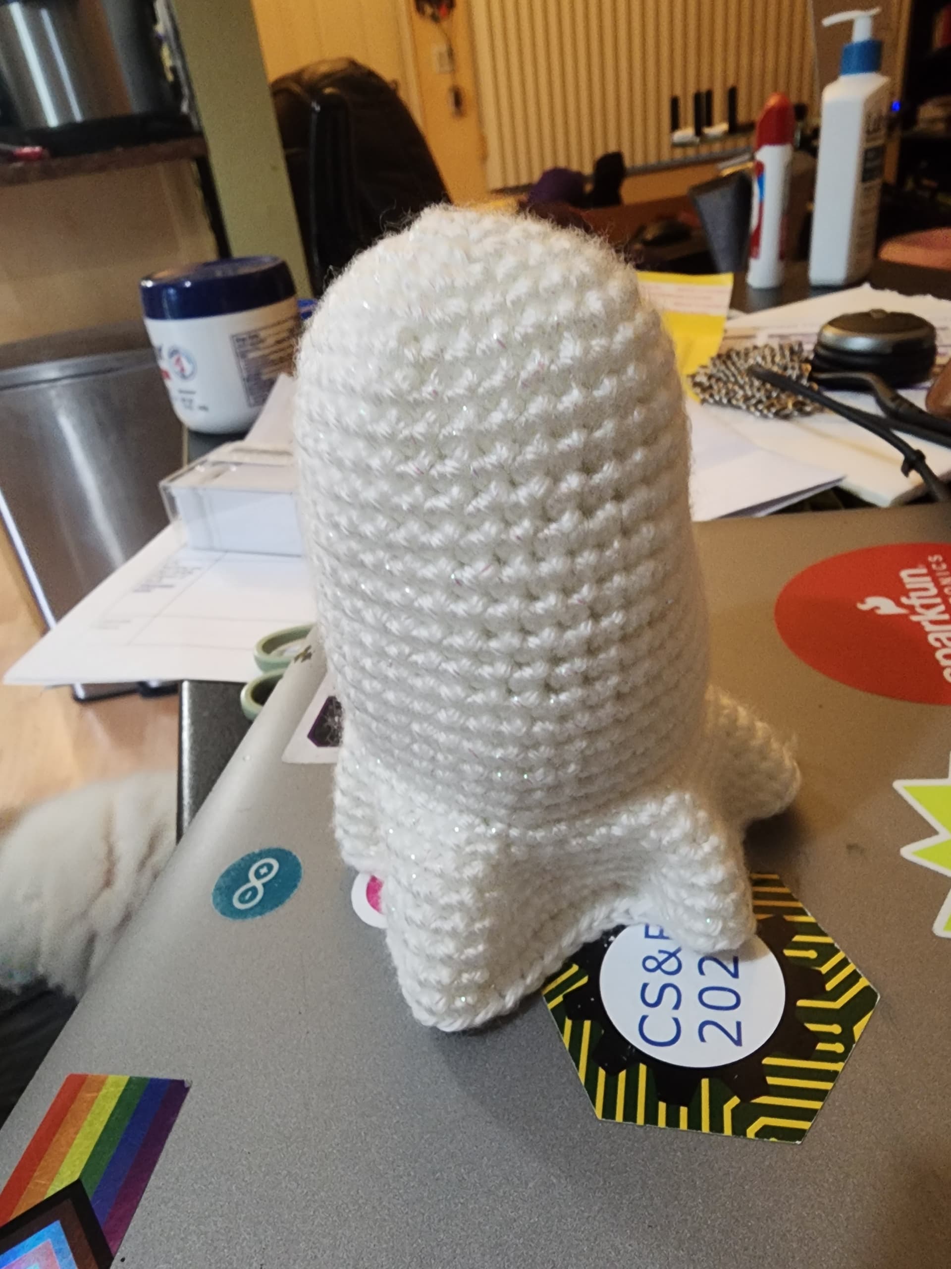 Brief Description: I tried a ghost like @Smeddley but I started the skirt part too late and now he looks more like an Adipose wearing a skirt. I gave him to the dog.