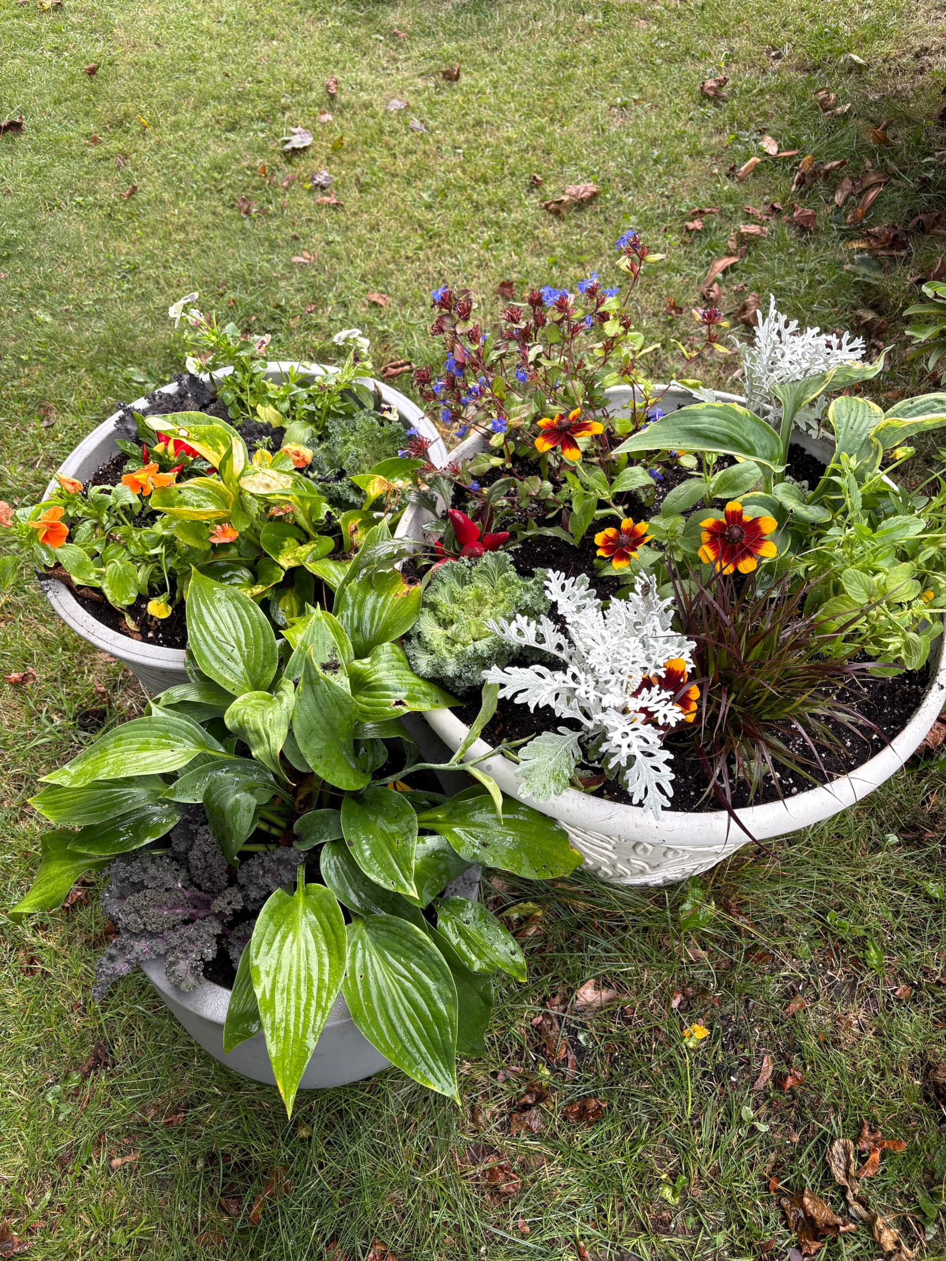 Brief Description: I have 2 trios of planters on either side of my front walkway, and last summer, I planted them up almost entirely with clearance plants in July. This year, I never got around to it, so except for the hostas, I only grew weeds. I went for breakfast this morning and it was right next to a garden center, so I strolled through, looking for some pansies. They didn’t have much, so I grabbed an assortment of their remaining fall annuals. I planted both sets of pots up the same way, but mirrored. I hope they grow a little to fill in before the cold weather kills off some of them. I realized when I was almost done that I could have divided the pansies, but I didn’t want to dig them up and replant them. The hostas are on their way out for the season, so I will fill the gaps with fake pumpkins and gourds (the squirrels just eat the real ones). Hopefully, like the best casseroles, this blend of plants turns out great!