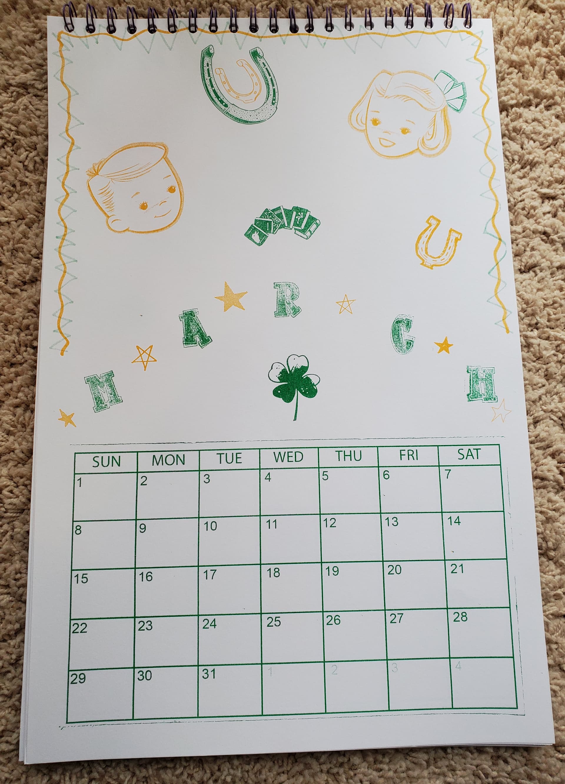 Prompt: Zap 1 Team: Pepperoni Posse Project Name: March calendar page Project Link: N/A Brief Description: We didn’t have enough people at the program to fill out the calendar with 1 page per person, so I picked up March as well and quickly banged this out. Project Photo(s):