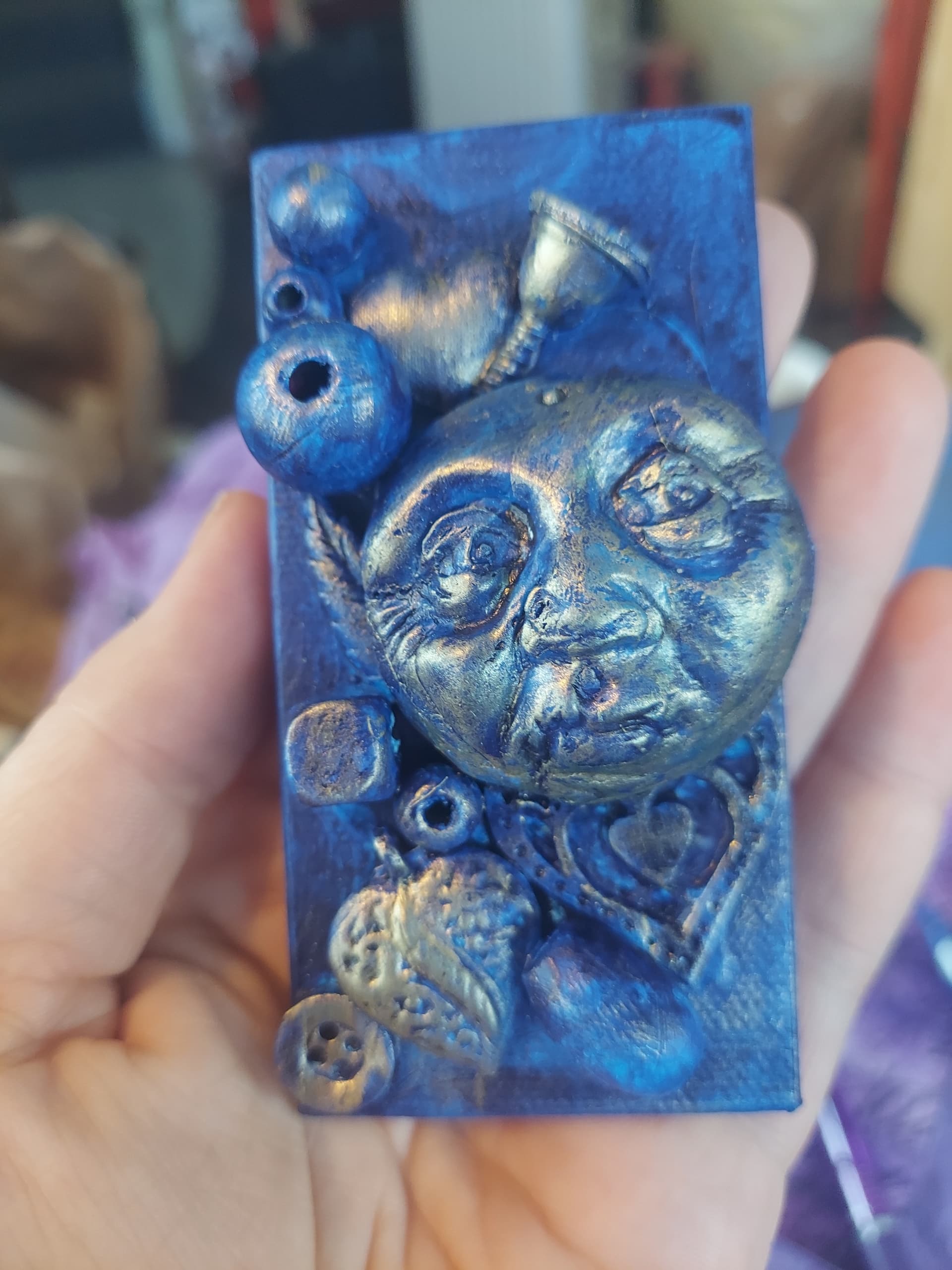the grumpy face is a polymer clay face made using a moon face mold.