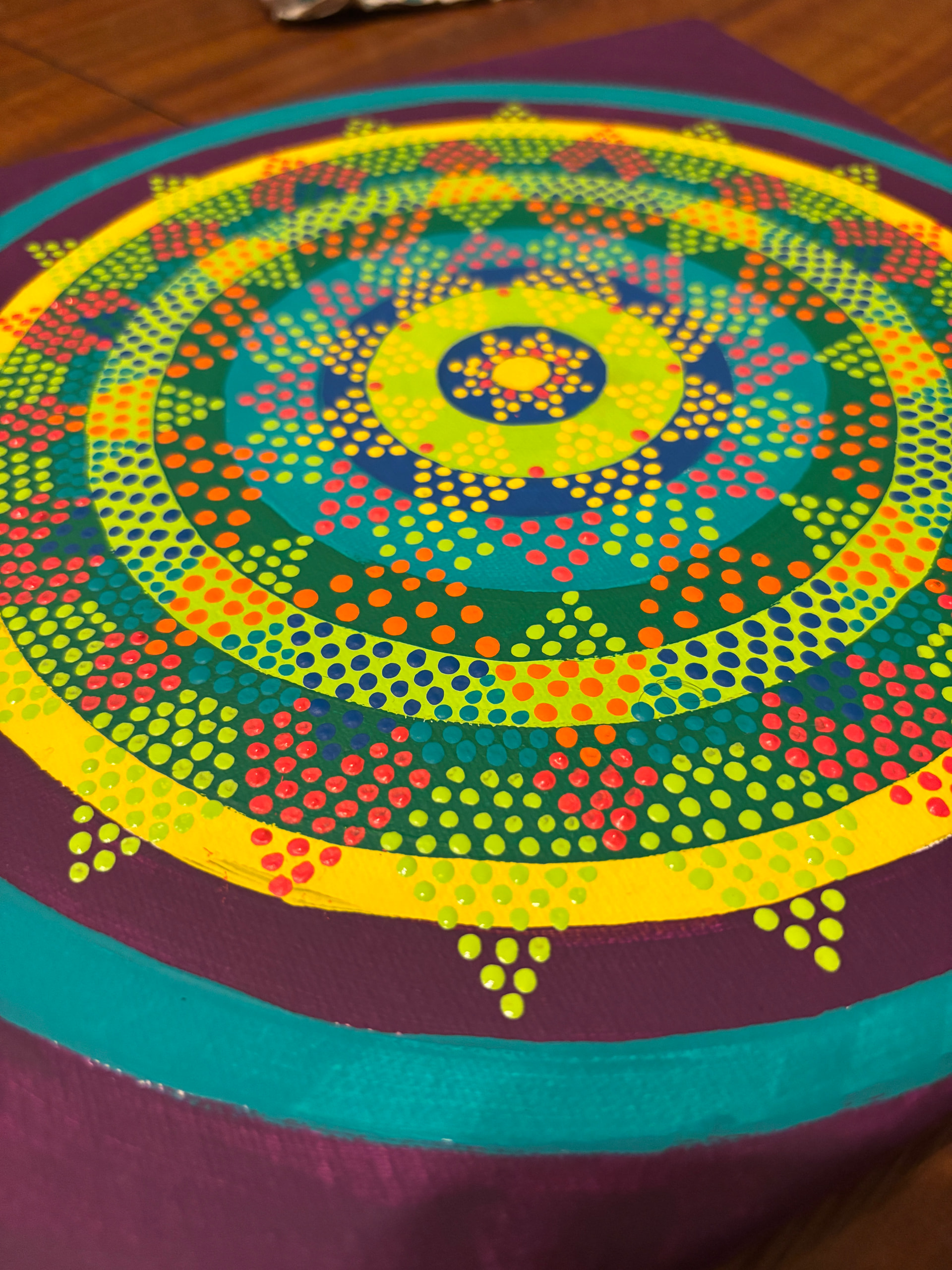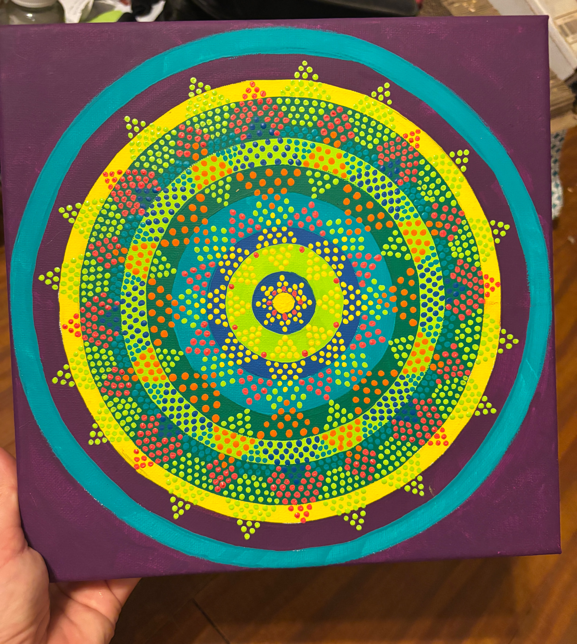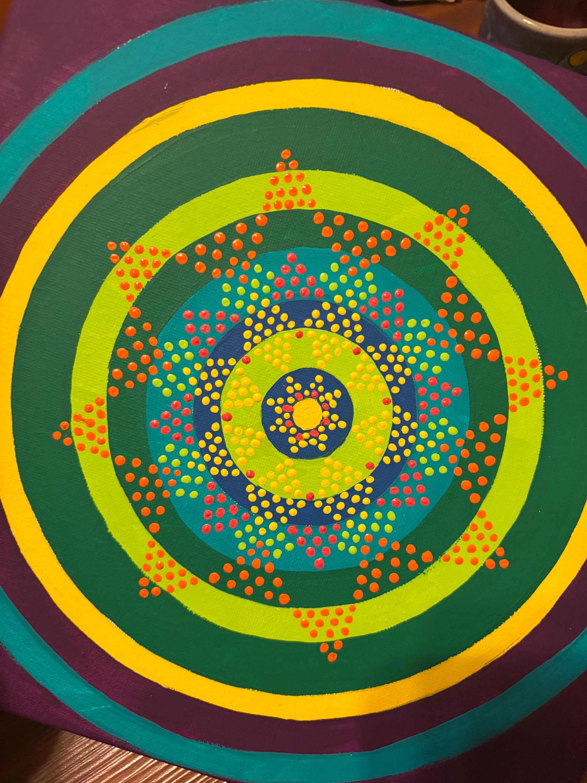Then, I just started from the middle and ad-libbed outward until it was mostly full. I painted in bits kver several days because my far-sightedness is finally catxhing up with me and these dots were making my eyeballs go a little batty!