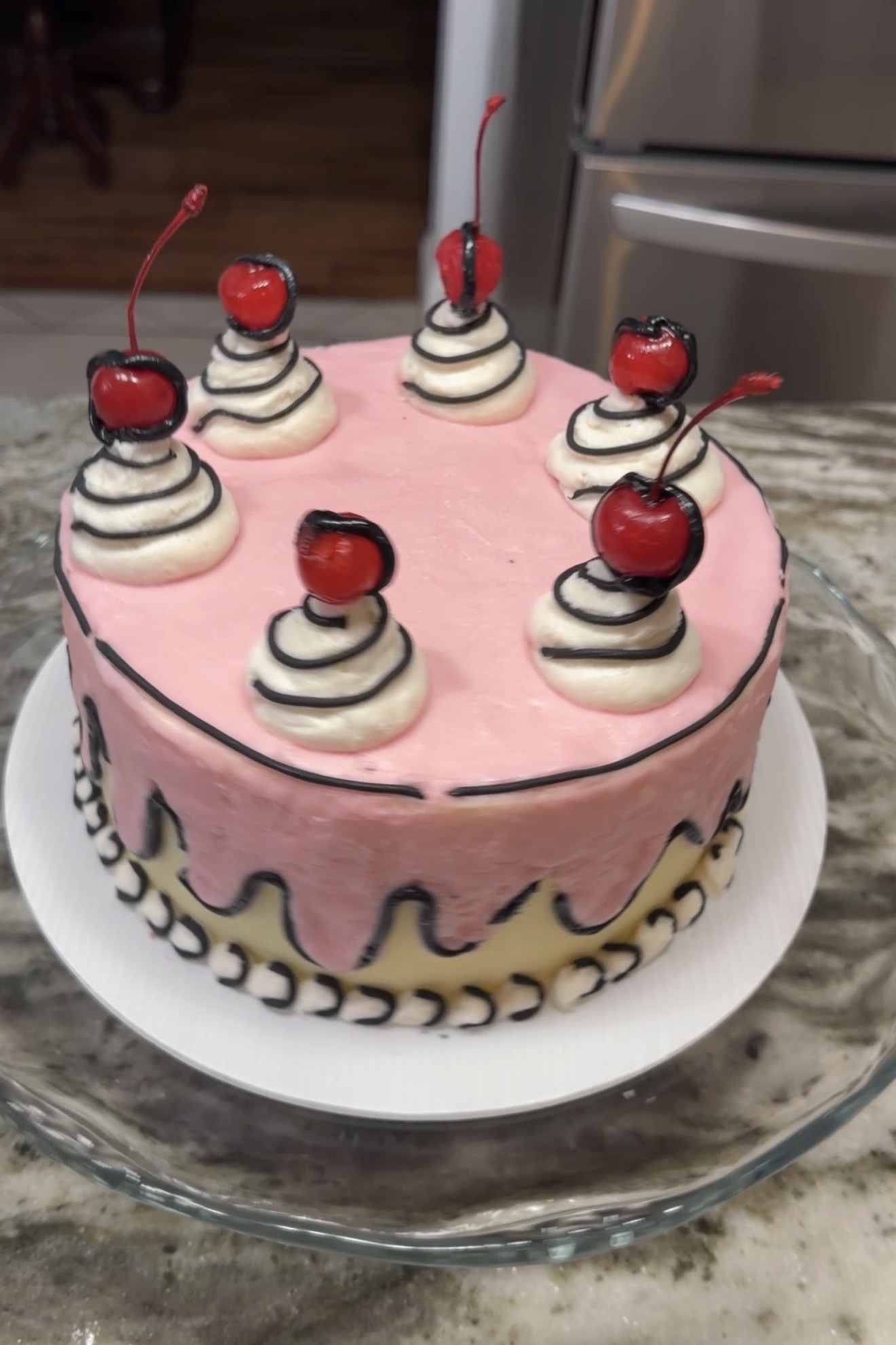 Frost form with yellow ganache and pink buttercream “drip”, black fondant piping thru a fondant extruder, and cherries wrapped in fondant to look like a comic book cake