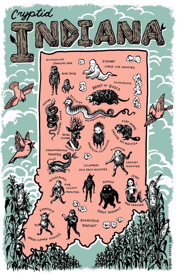 On a related note… the artist, Mab Graves, just revealed a passion project she’s been working on involving cryptids in Indiana and just dropped this tea towel. I am inspired.