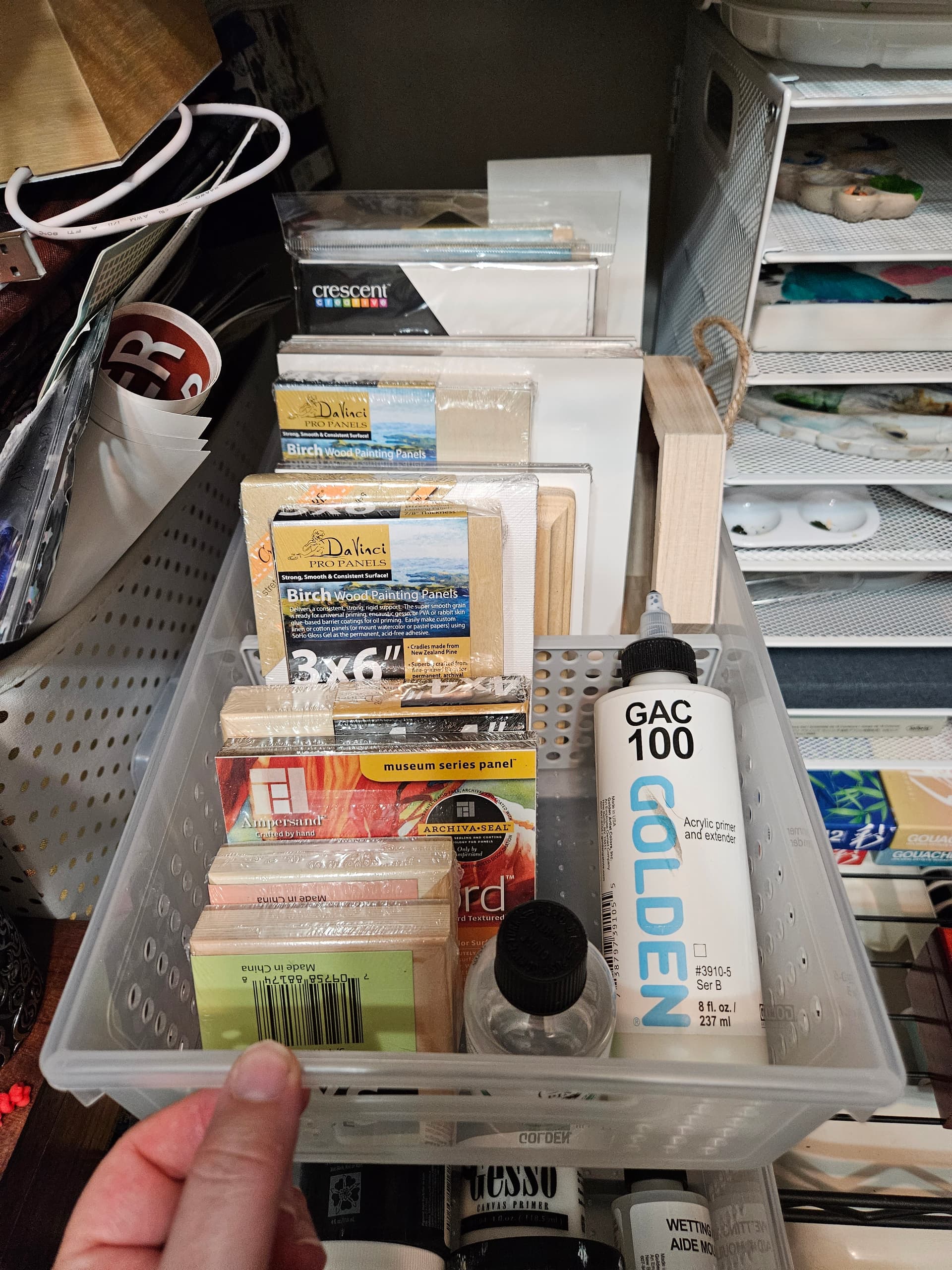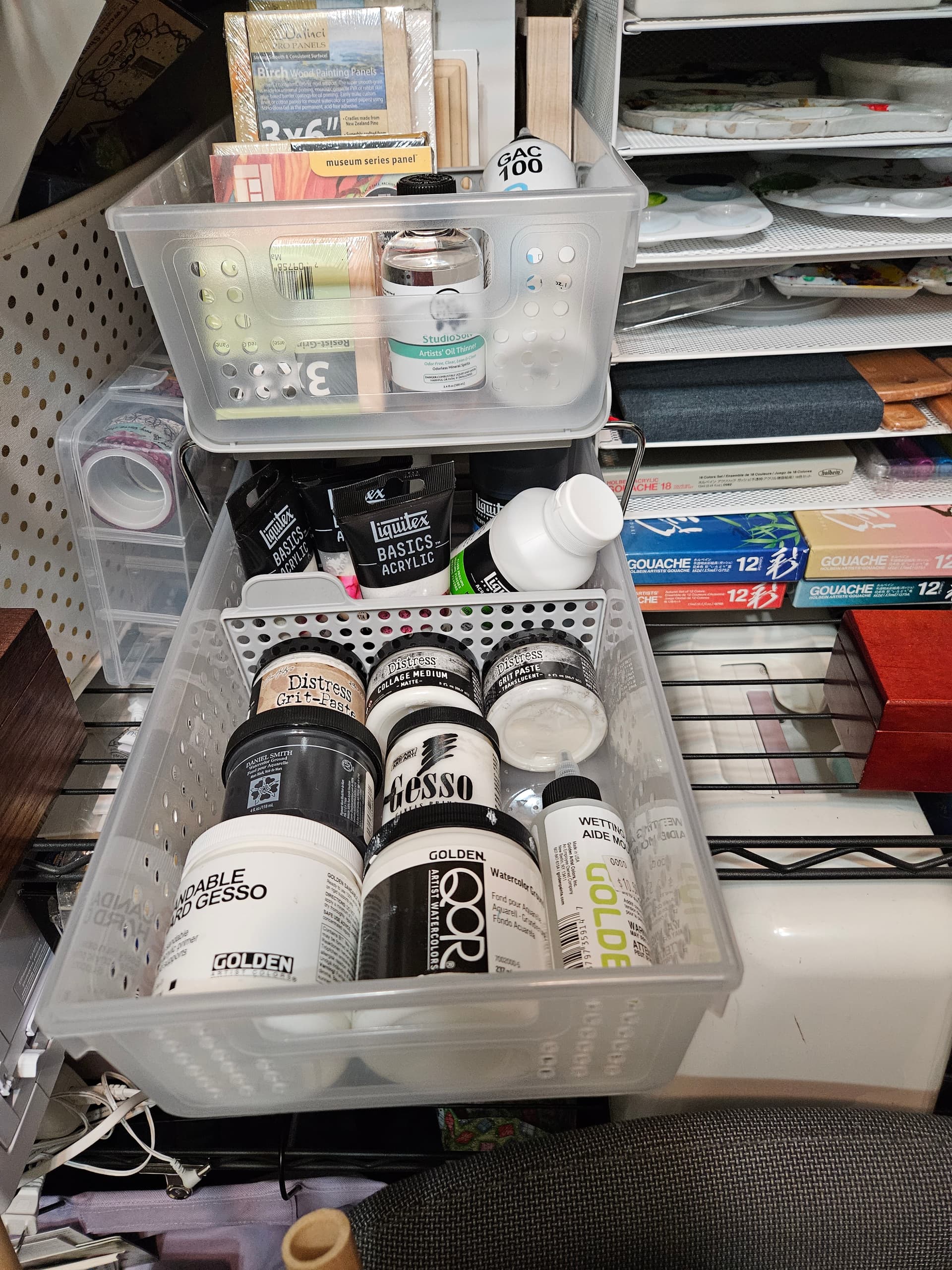 Next, a small set of 2 pull out shelves, which is next to the tiered tray. In the top I have my mini substrates (cradleboard, aquaboard, etc). In the bottom my various mediums, gessos, and watercolor grounds.