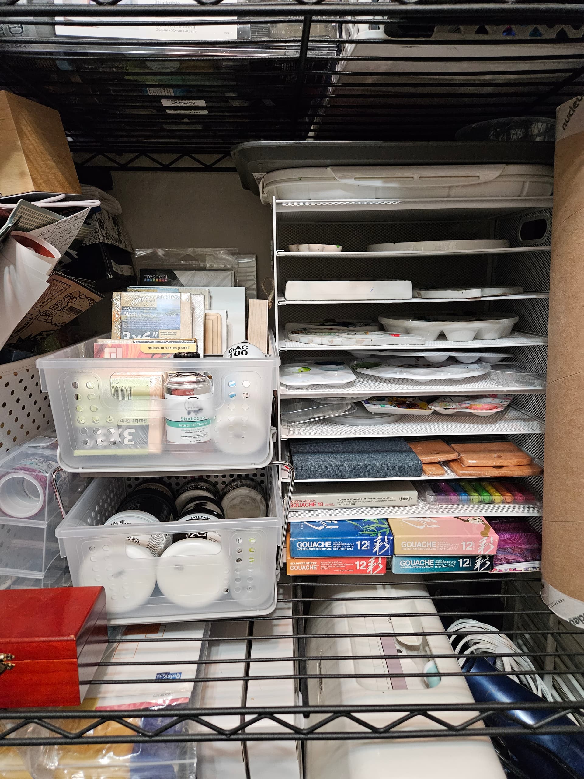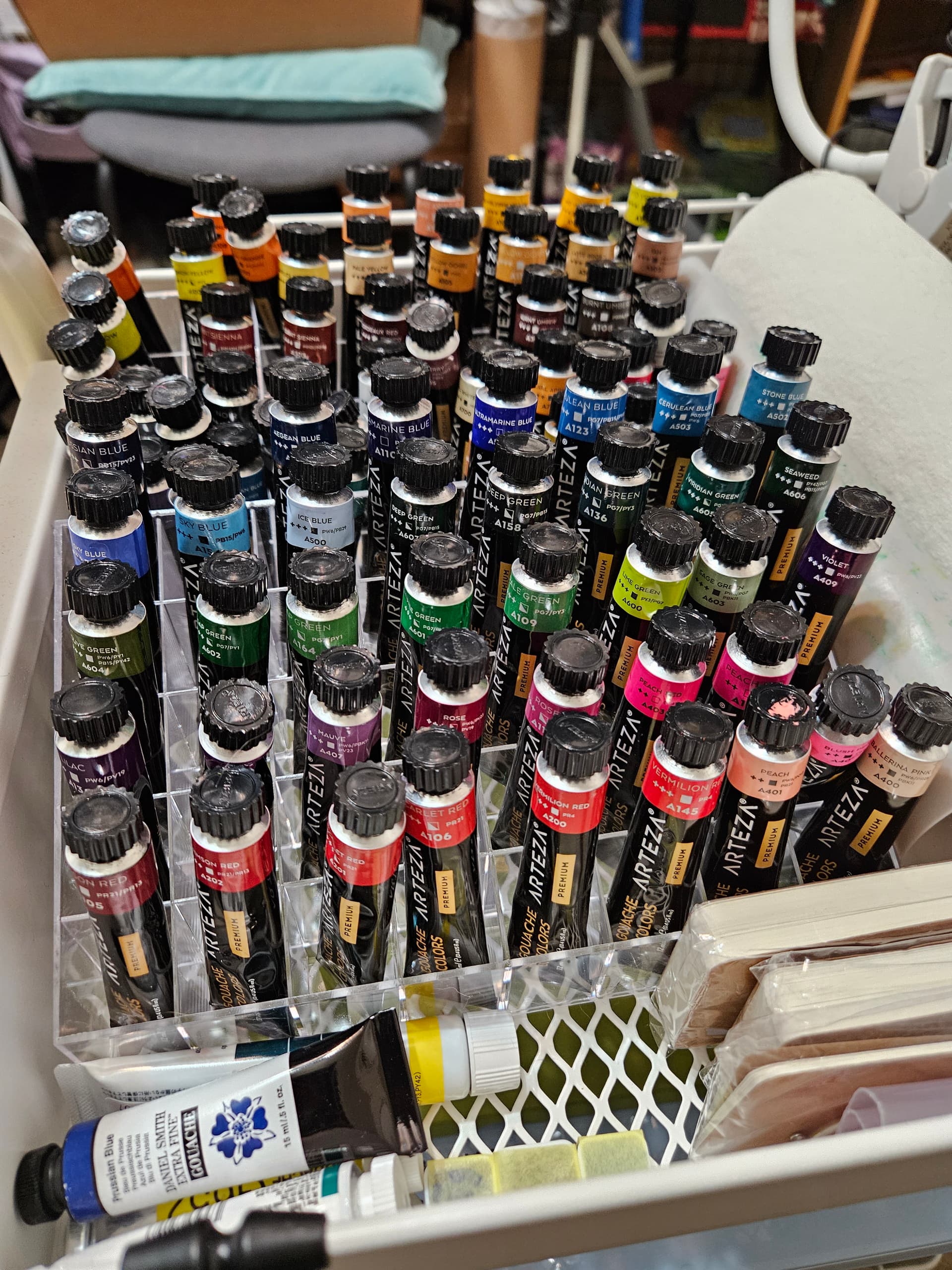 Everything else, I already had. Such as the rolling cart I FINALLY cleared out and turned into an art cart. And the 80 slot paint holders I finally loaded up with some of my gouache.