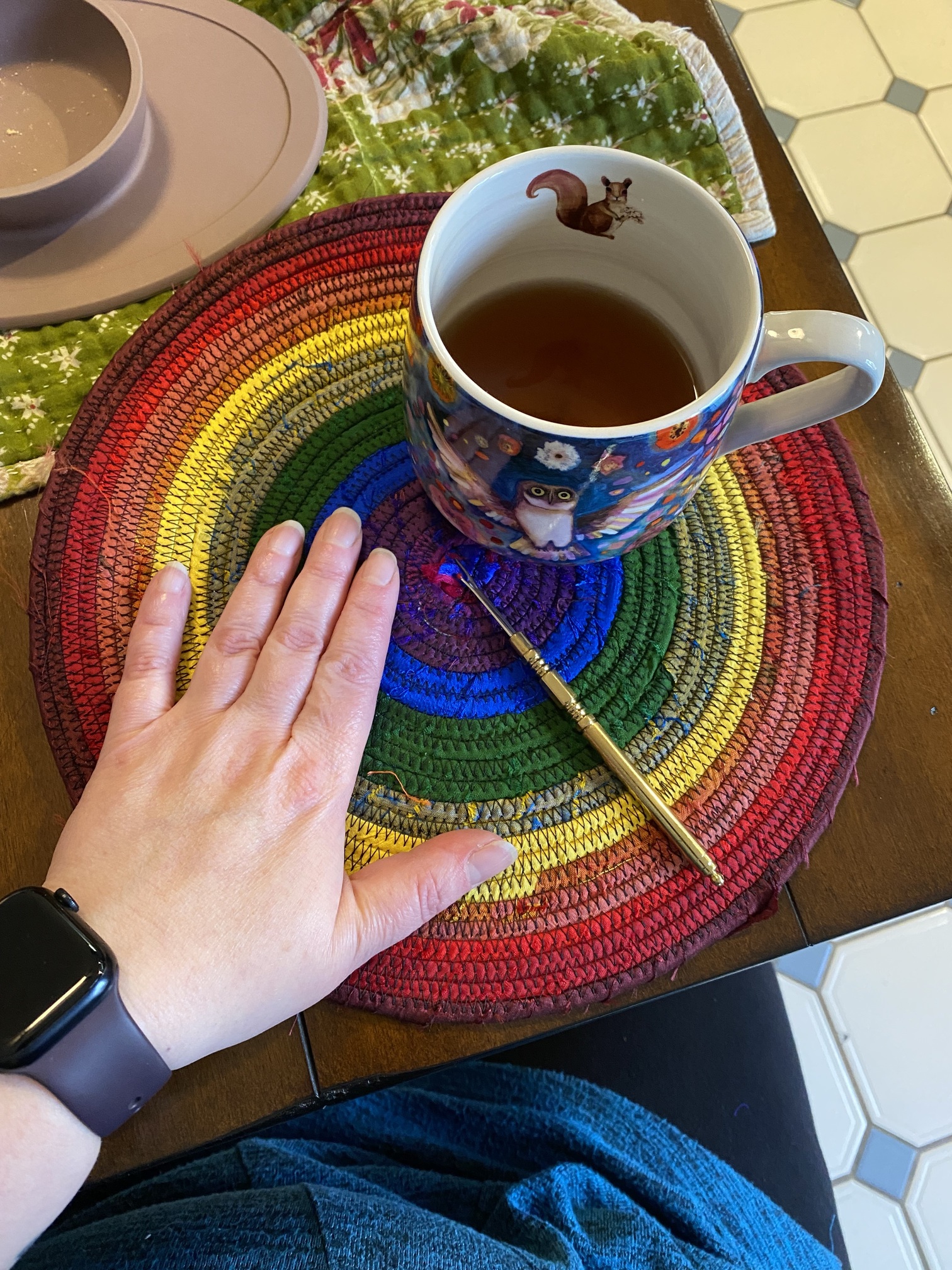 Opinions needed. I “finished” the rainbow silk trivet last night, that I decided to make for the Mod Bundle yesterday. But in my rush to finish it got a bit wobbly. The edge curled a bit so now it won’t sit flat. Overall it’s about the size of a dinner plate (but smaller than a placemat). I have to rip back the stitches to fix it. Should I redo it as a flat mat, or curve it on purpose into a bowl?