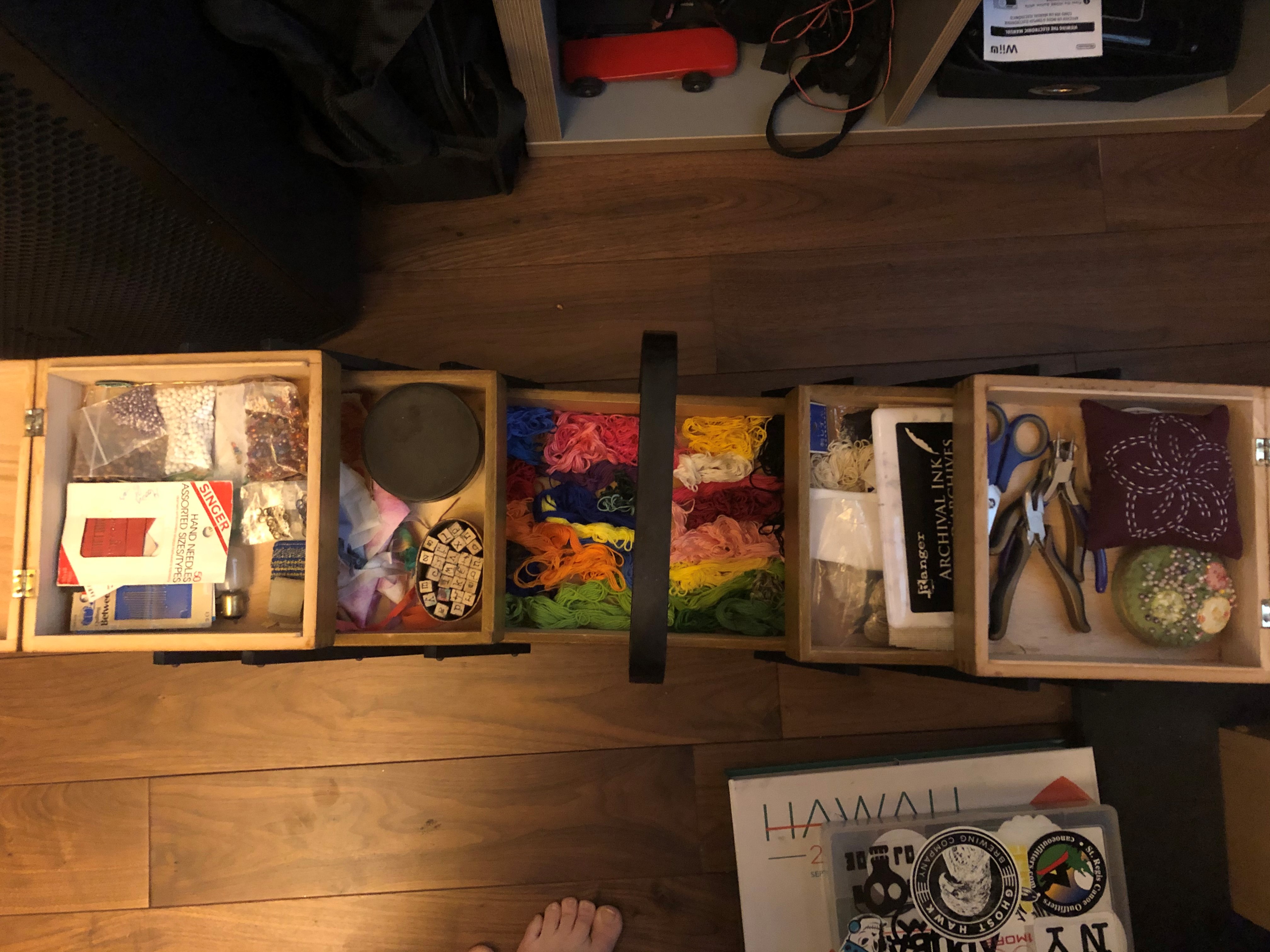 Yesterday I went on an organizing rampage. I cleaned out the craft room and organized my most frequently used supplies in my sewing box - which now lives in the living room for easy access: