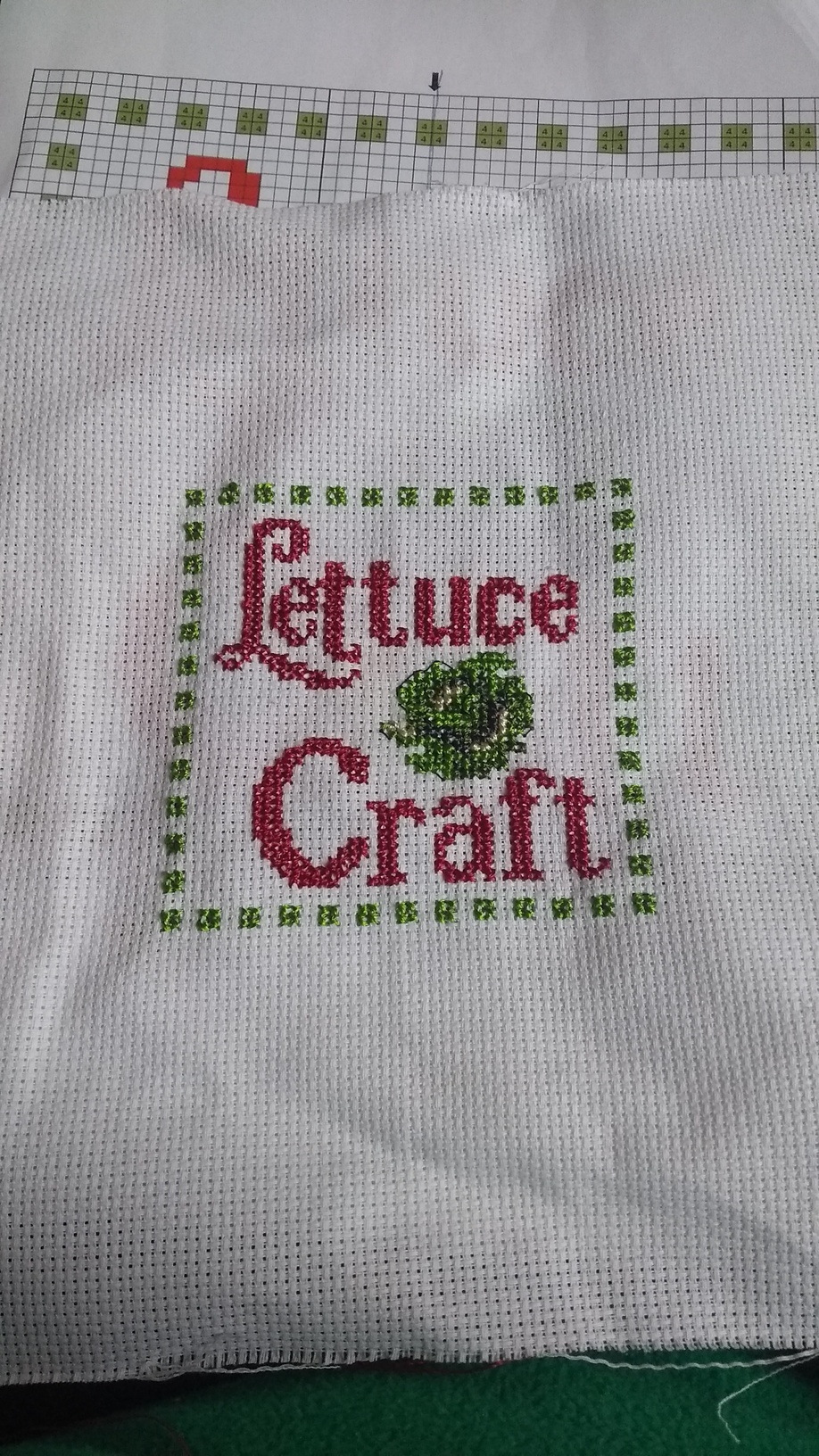 I’ve finished my lettuce craft cross-stitch. Pretty pattern, and I’ve not done cross stitch in years.