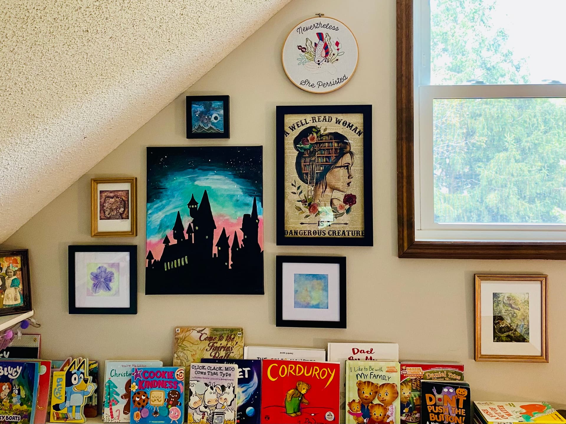 At that point, this turned into a full-on project. I started digging around the house for artwork that hadn’t been unpacked since the move, or had never been framed. I thrifted and ordered a few frames from Amazon and Michael’s (thanks $30 in Rewards vouchers!), and started hanging my treasures above the shelves. There’s an embroidered hoop from @kittykill, a watercolor of the night sky from a friend, a print of a cool assemblage art piece that I bought at Universal Studios with @Abbeeroad and @FiberAlchemist, a poster given to me by my awesome MIL @Millykay that says “a well read woman is a dangerous creature”, two watercolors my husband painted for me, a big canvas of Hogwarts that I made at a Wine & Paint night, and a print of a little girl having tea with a dragon that I bought from an artist on Etsy years ago. All things I loved, but could also work well in a little girl’s space.