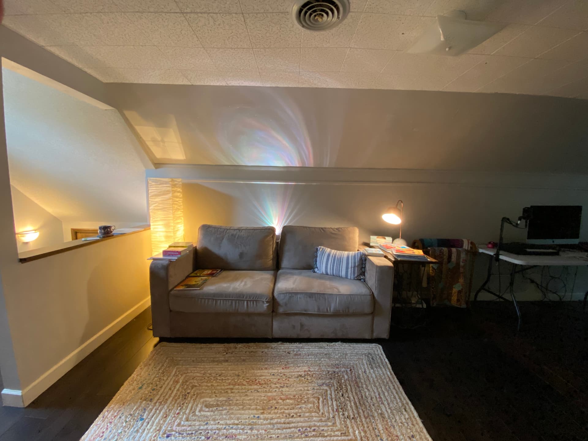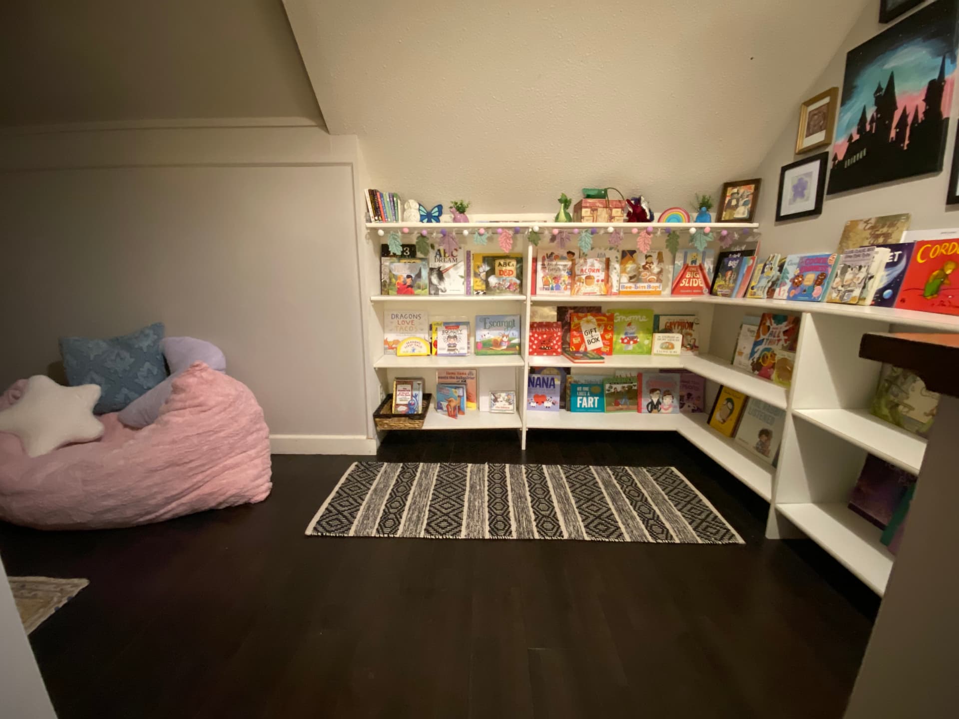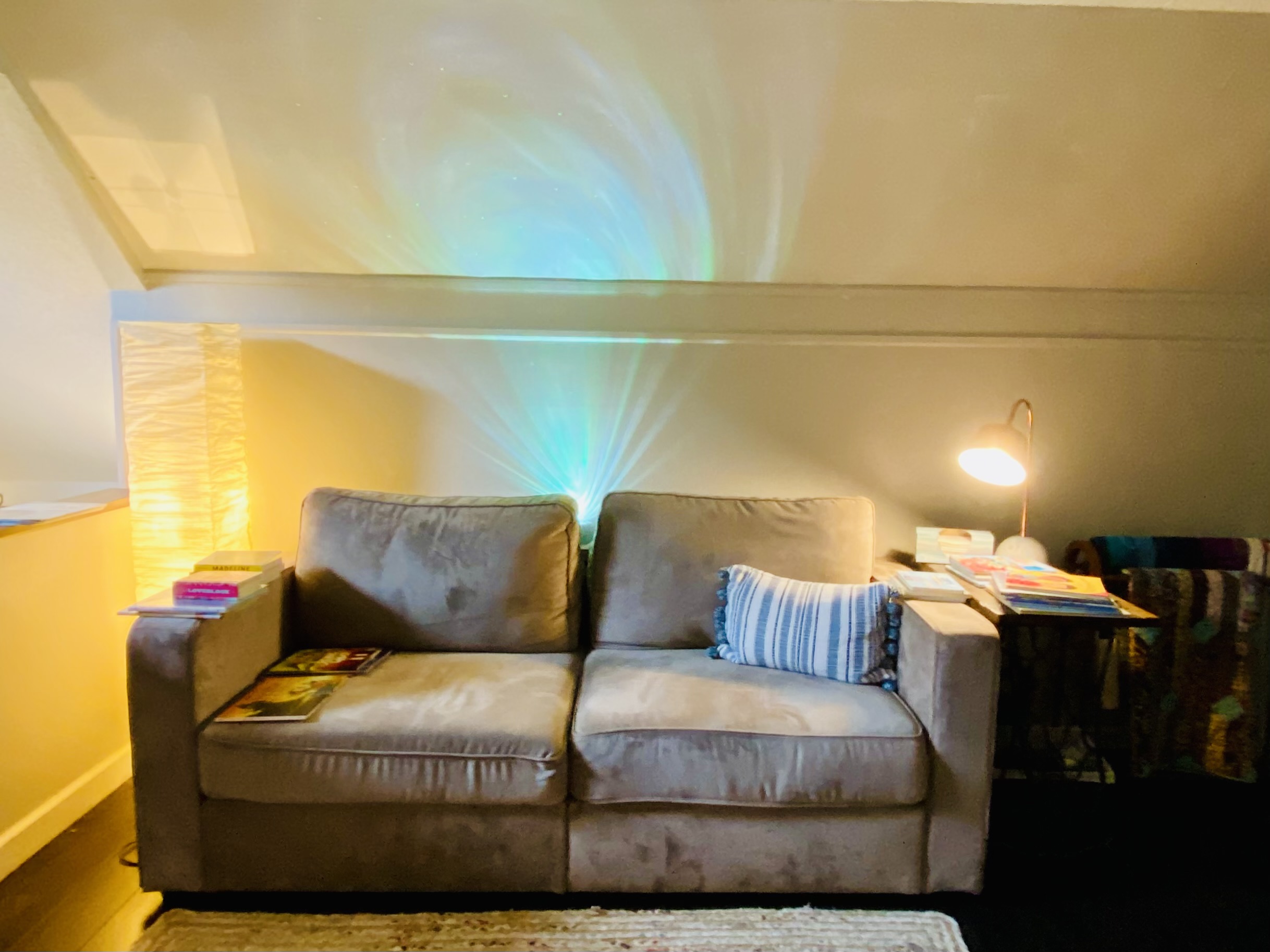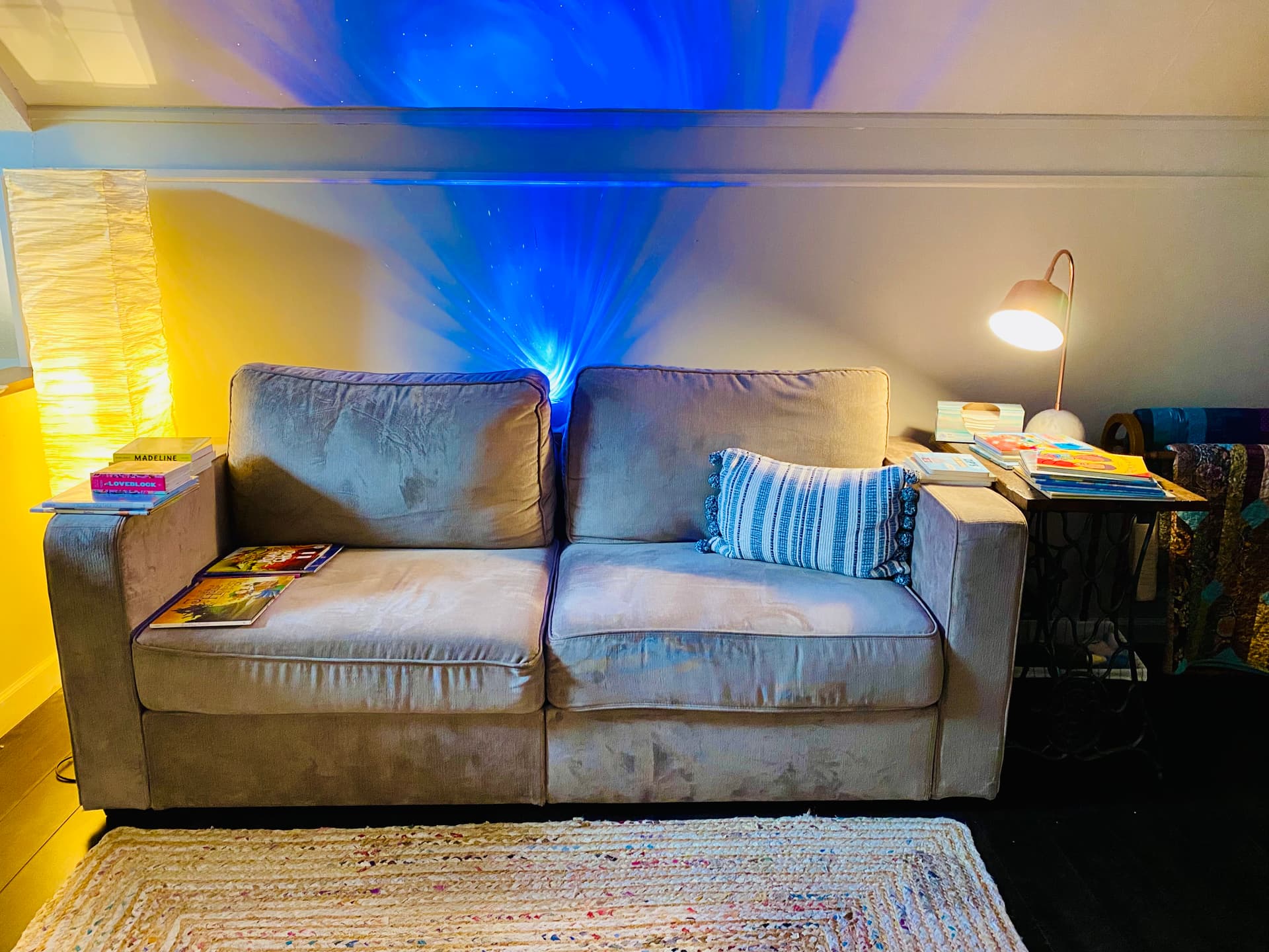 Beside the “Story Couch” I added a spare side lamp, as it’s always dim up there when I’m reading to her at night. Then I finally, FINALLY, set up the star projector that we bought for Ada’s second birthday party (she’s now 3.5) behind the couch. It projects stars and color-changing nebula up along the wall and eves above us as we read stories at night. And I added a quilt rack I found at Goodwill beside the table, so there are plenty of cozy quilts to snuggle with as we read. The pillow was another from mom, and the rug was from our kitchen in the last house.