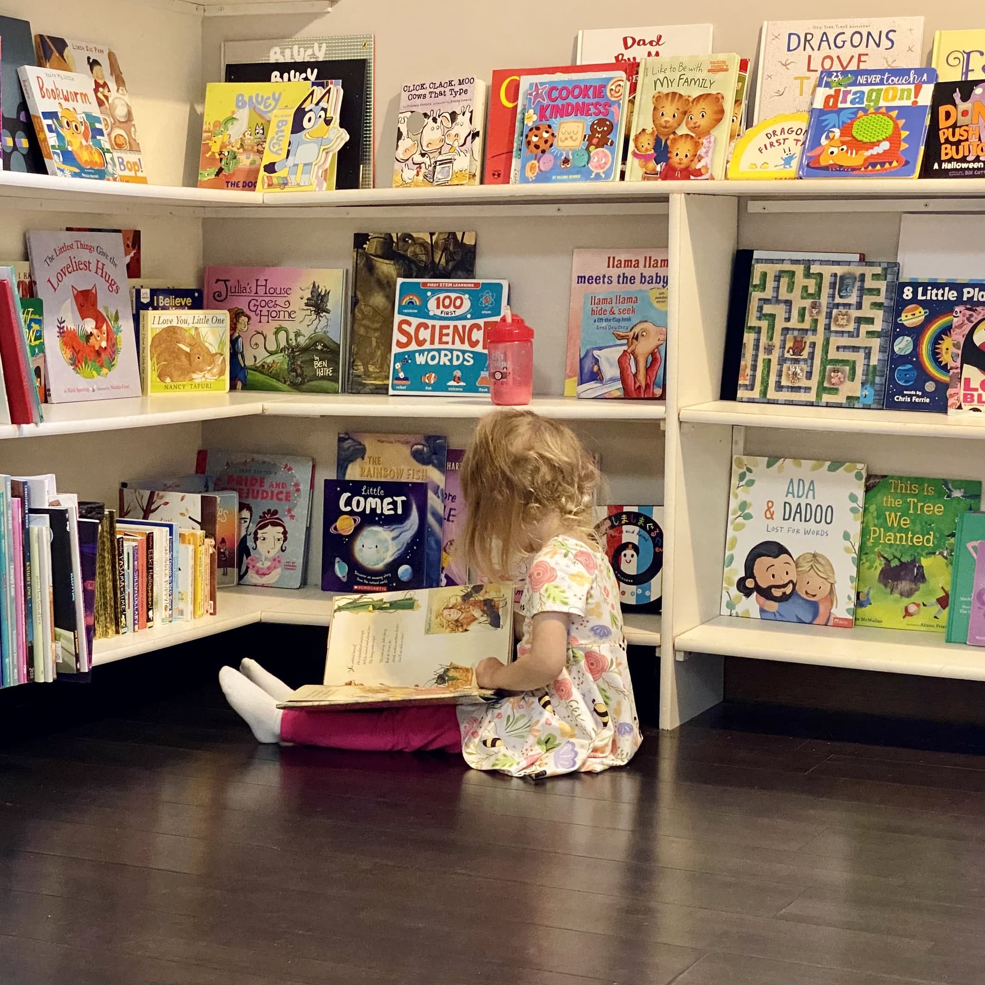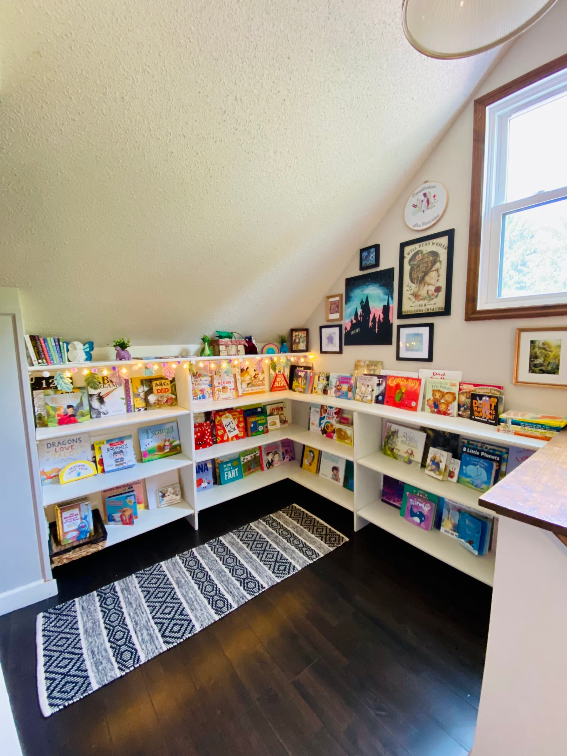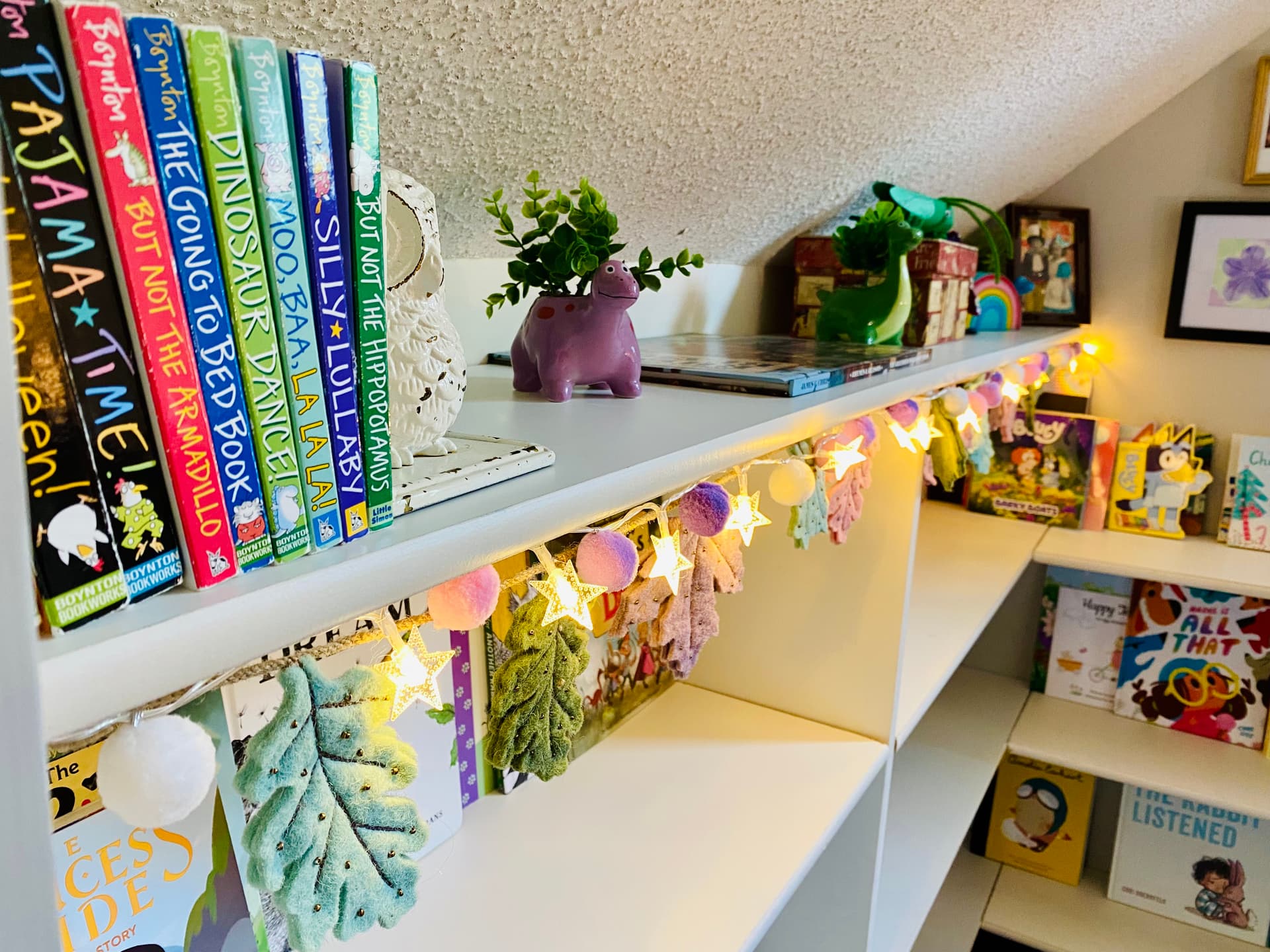 I added some battery operated star string lights with pastel pompoms along the uppermost shelf, using tiny clear Command hooks. (The battery pack is hidden behind the Susan Boynton books). I bumped into a 6’ long garland of embroidered and beaded felt leaves in shades of pink, purple and turquoise at Homegoods, so I added that to the string lights. Ada loves decorating for holidays, so I think I’ll find/make various garlands to swap out seasonally in that spot. Since our end of the library has art and knicknacks along the top shelf, I filled hers that way too, shopping around our house for stuff. The faux plants in dinosaurs were a gift for her from my mom. The white owl bookend came from our end of the library, which she loved and used to go visit to give kisses. The toilet paper tube cricket is one we made together over the summer.