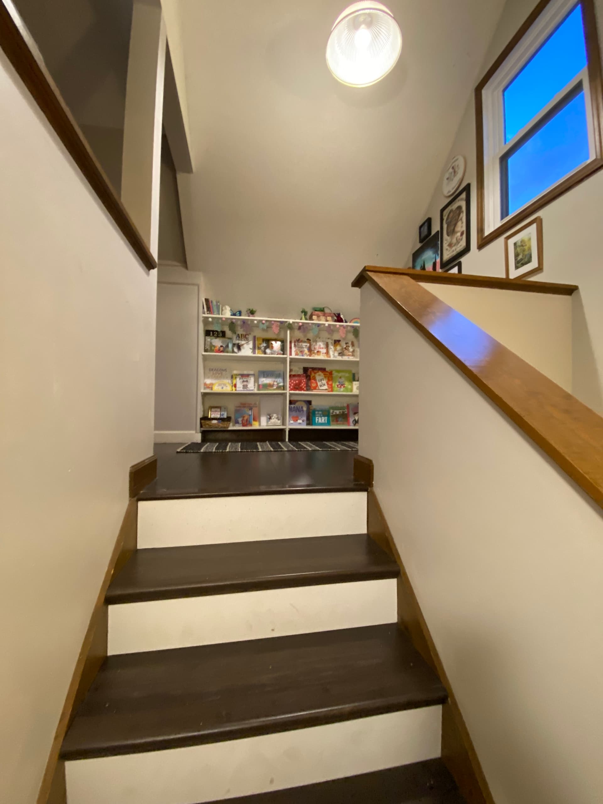 Finally I added a black & white runner in front of her shelves, and another in front of the reading chair in the grownup end of the room. They came out of our guest room, when I bought a new rug for in there a few weeks ago. While we didn’t do any painting or true renovation, I really love how this project came out. Someday we’ll paint, and replace the overhead lights, but for the time being, soft lighting and cozy touches make it a much more comfortable and welcoming space. Ada now spends most afternoons up there, reading books, and daydreaming on her bean bag, neatly avoiding us saying “no” to more tv.